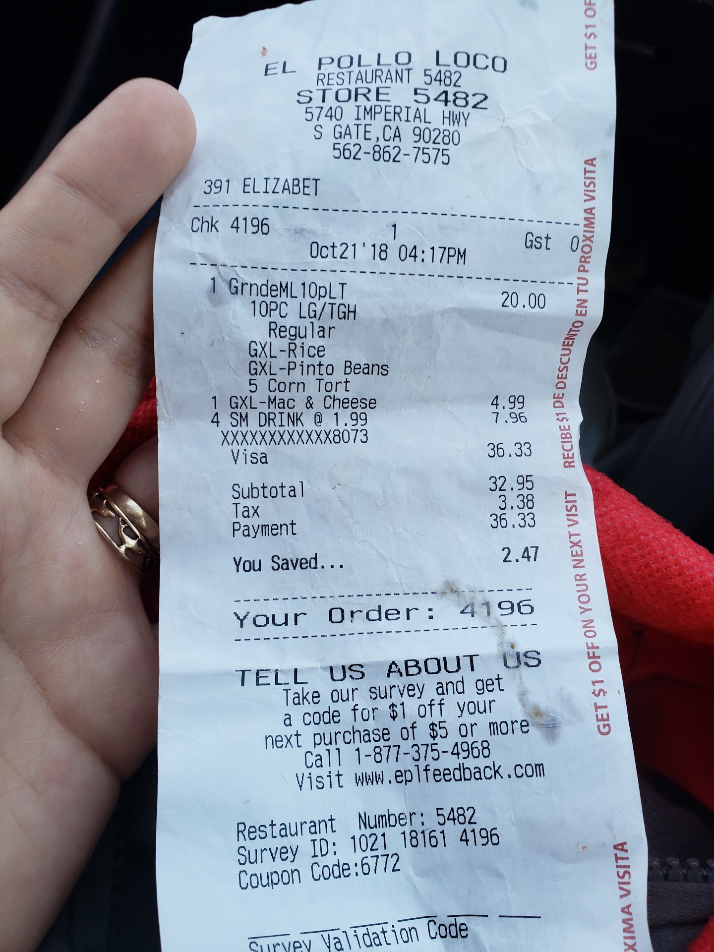 With COVID-19 and what not. 4 years later this place still doesn't uphold the value of what El Pollo Loco does. I worked at a very busy one and we knew service and what it meant.
