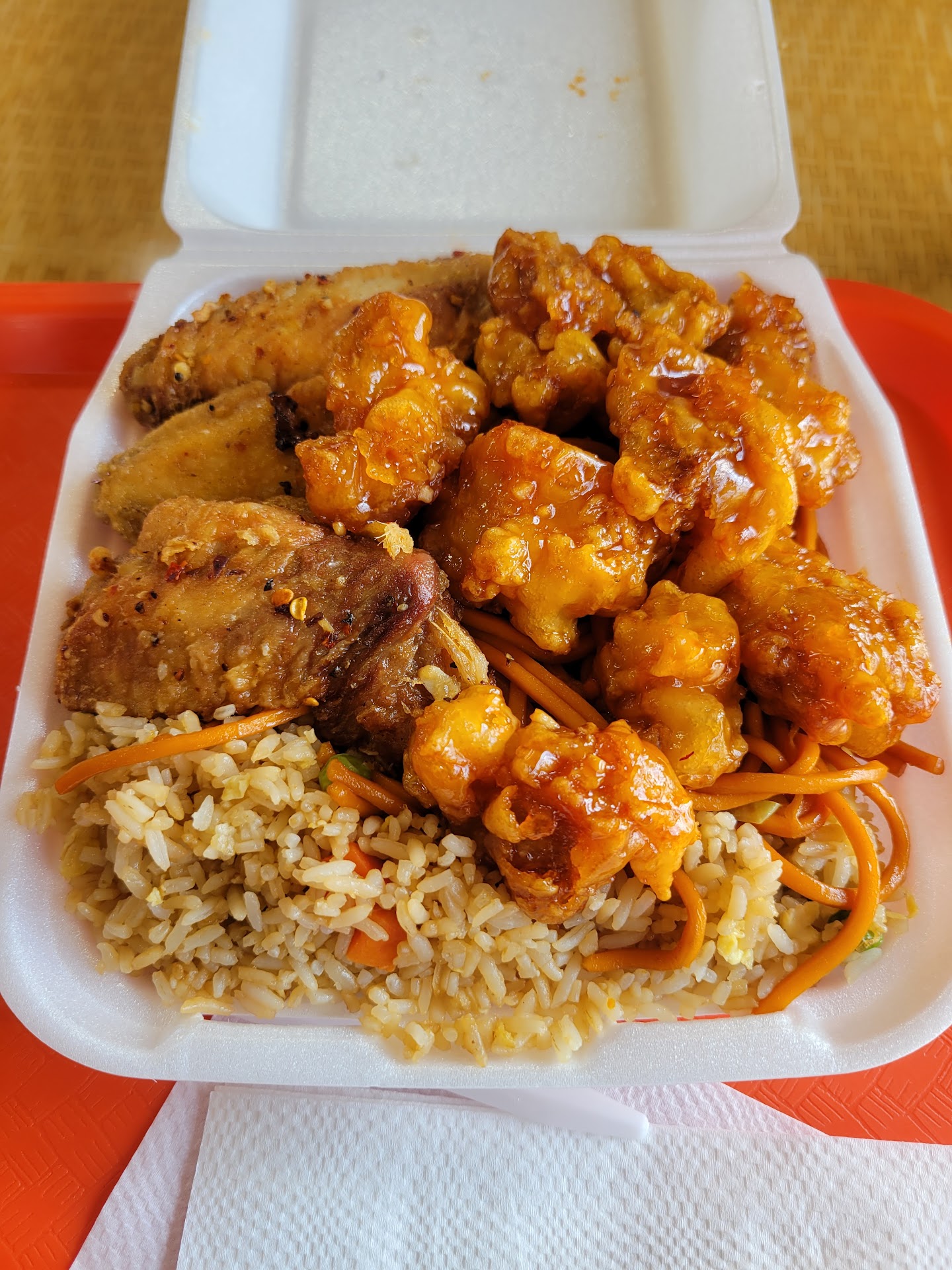 I really do not care about the restaurant decor or condition because I do not like to dine-in alone in public. But the place looks and feels welcoming. I rather take my food home. I got Combo B and I tried the Chicken Teriyaki, Orange Chicken, wings, and Broccoli Beef.
