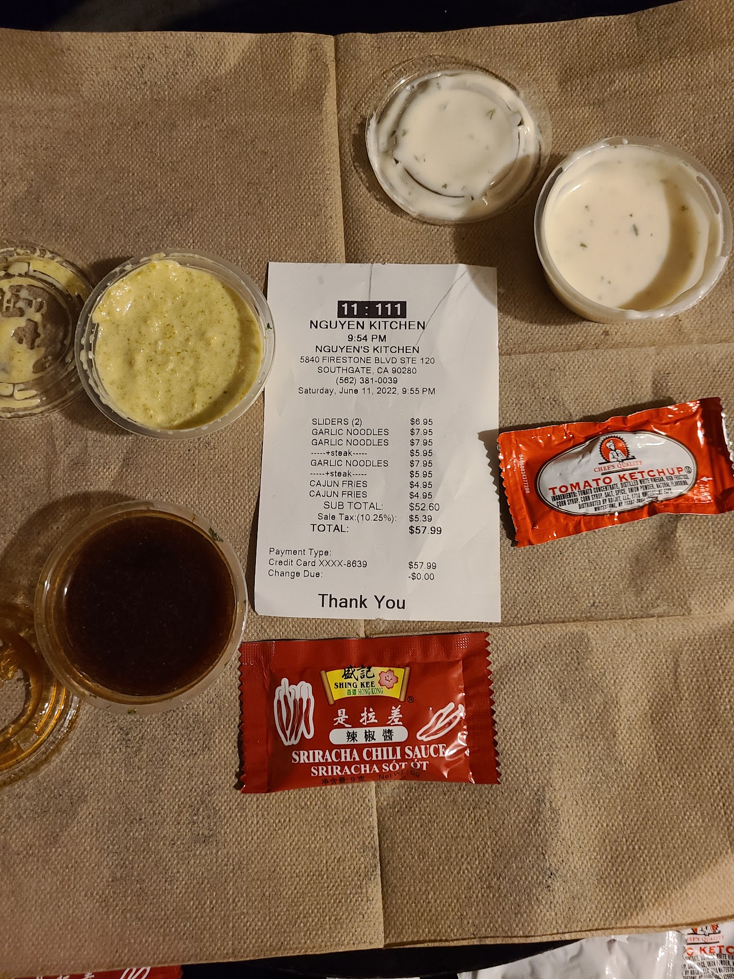 My wife went with her sister and mom about weeks ago. She brought home garlic noodles and garlic noodles with steak. I was too full when she got home so later in the day I tried the steak with garlic noodles...WOW it was good. So I couldn't wait till we got food from there. Today...06-11-2022 after my nephews graduation, my wife and my kids drove there (only about 5 miles compared to 12-ish miles if driving from home). We got 2 orders of garlic fries, 2 orders of garlic noodles with steak, 1 order of garlic noodles and 2 plain sliders. They gave us some sauces. The brownish was good with the garlic noodles with steak. The greenish not sure did not use it..sort of a little spicy with a sweet taste (Wasabi with mayo?) Also gave us ranch dressing (for garlic fries?) And Sriracha packages and tomato ketchup. **the 2 plain sliders (no onions no mushrooms)...I asked for cheese (they don't have cheese). Well my picky daughter (19 yr.old) didn't like they sprinkled green stuff and then it had a white looking sauce (looks like mayo). But over all. ALL the food was great...coma effect...especially since by the time I write this it's 11:47 pm. Oh...fyi...they are open till 1 am... By the time I wrote this..my son and I were done with the garlic+steak noodles and my wife was done with the garlic noodles..so maybe next time I'll take a...