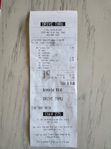 Ā Ā Ā Read moreWe went through the drive-thru, after looking over the menu we ask them if the tuna had onions or anything in it? she responded the number 3 or 11. We responded the number 3. She continued on saying what else? We asked her again if the tuna had anything in it? She said no just cucumber. So we ordered it and also ordered a giant 23 I believe. Not sure but our total was 48.28 pretty pricey⦠we pull up to the window and we see them making our sandwiches they are slow. We waited a few mins prob 5-10 mins. We got our sandwiches pulled over to eat in the parking lot. I go to open my sandwich (#3 tuna) I see thereās a lot of cilantro ! EW! YUCK! I took one bit and didnāt like it at all! My bf says go ask them for another sandwich, I refused because the service we received. I asked the lady if there was ANYTHING in the tuna she said no! Disgusting sandwich DO NOT GET THEIR TUNA! So lucky me thereās chipotle I only spent 12-13 dollars on my bowl with chips. They were so kind and fast paced. It really hit the spot, this was my first time trying chipotle I been seeing everyone rave about it but never gave them a chance because of their meat issues in the past. Worst jimmy Johnās I would recommend the Tacoma location or University Place. I do not like onions, cilantro I prefer my tuna just...