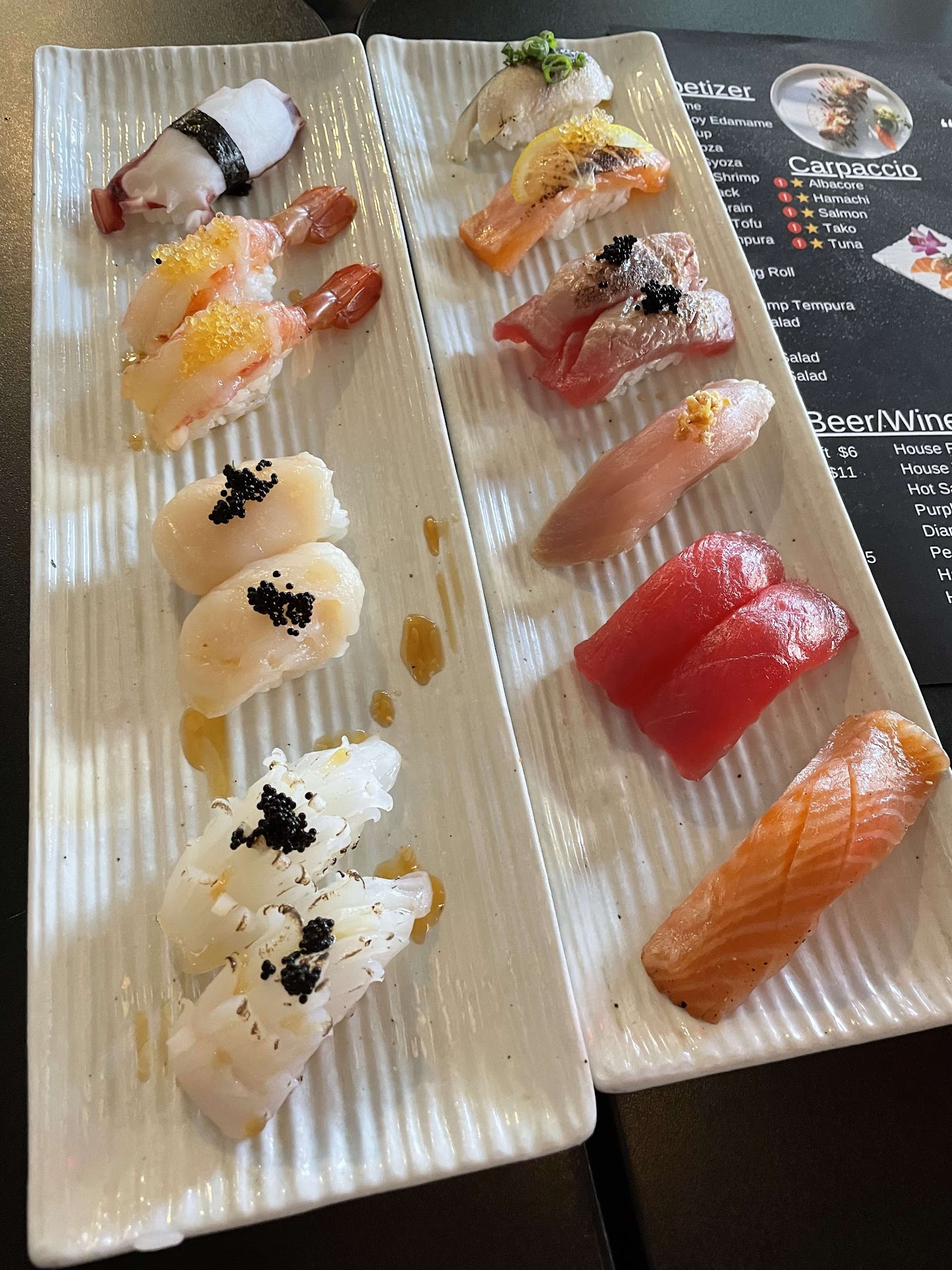 I also felt there were too many limitations even when we were paying a lot more for the premium option. Of the premium items, more than half of them can be ordered only once, and we're talking about ONE piece of nigiri only, not even two. They also limit the number of rounds you can order the premium options to three, which was really unnecessary because most items can be ordered once anyway. But at first it made me kinda stressed to have to make sure I got what I wanted within the three rounds. What I also didn't enjoy about this experience was that there was a large amount of nigiri with a lot of rice. I wish there were some sashimi options other than the carpaccio. I saw on the menu that there was a "Blue Fish Signature Sashimi Plate (Extra Order) $12." I thought it meant the first plate is included in the ayce, and any extra orders would cost $12; turned out it's not part of the ayce. They should change how the menu is formatted so that it's not confusing. I understood how drinks would cost extra, but didn't understand why they needed to put the sashimi price in green. Moreover, I was shocked when they told me I could only get one mochi ice cream. They already only had two options for desserts and the banana tempura one didn't look very appealing. I love desserts and wanted to try different flavors, but I was sad I couldn't. Those items aren't that expensive anyway. And what was upsetting to me was nowhere on the menu did it say we could only order it once, and they didn't mention that at the start either. I prefer the kinda of ayce where most things are laid out and you can choose the portion you want and don't have to wait for the server to serve you. I think it'll help them during busy times, too.