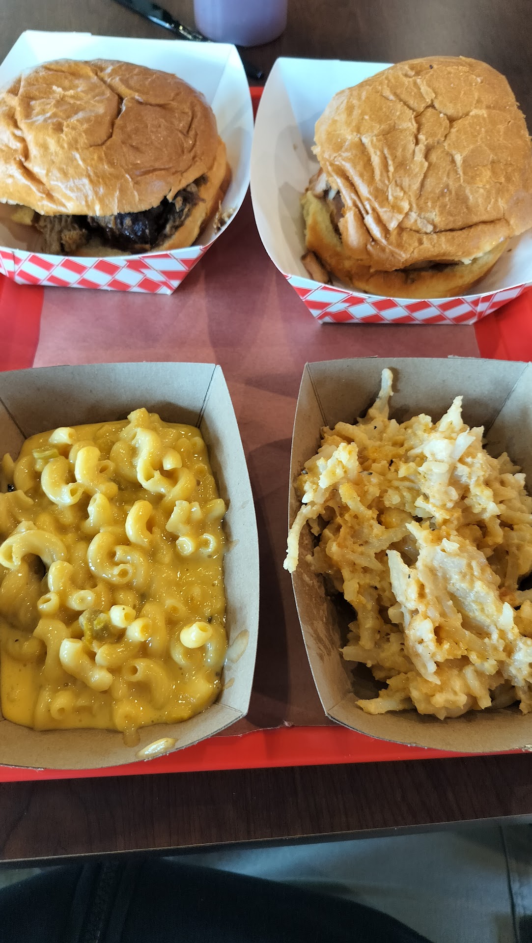 Select side dishes (menu boards are above the wall panel) when you walk in. Meat of choice. Drink selections. Make payment. They bring meals to your table. You go over to the soda fountain counter, add choice of BBQ sauce.