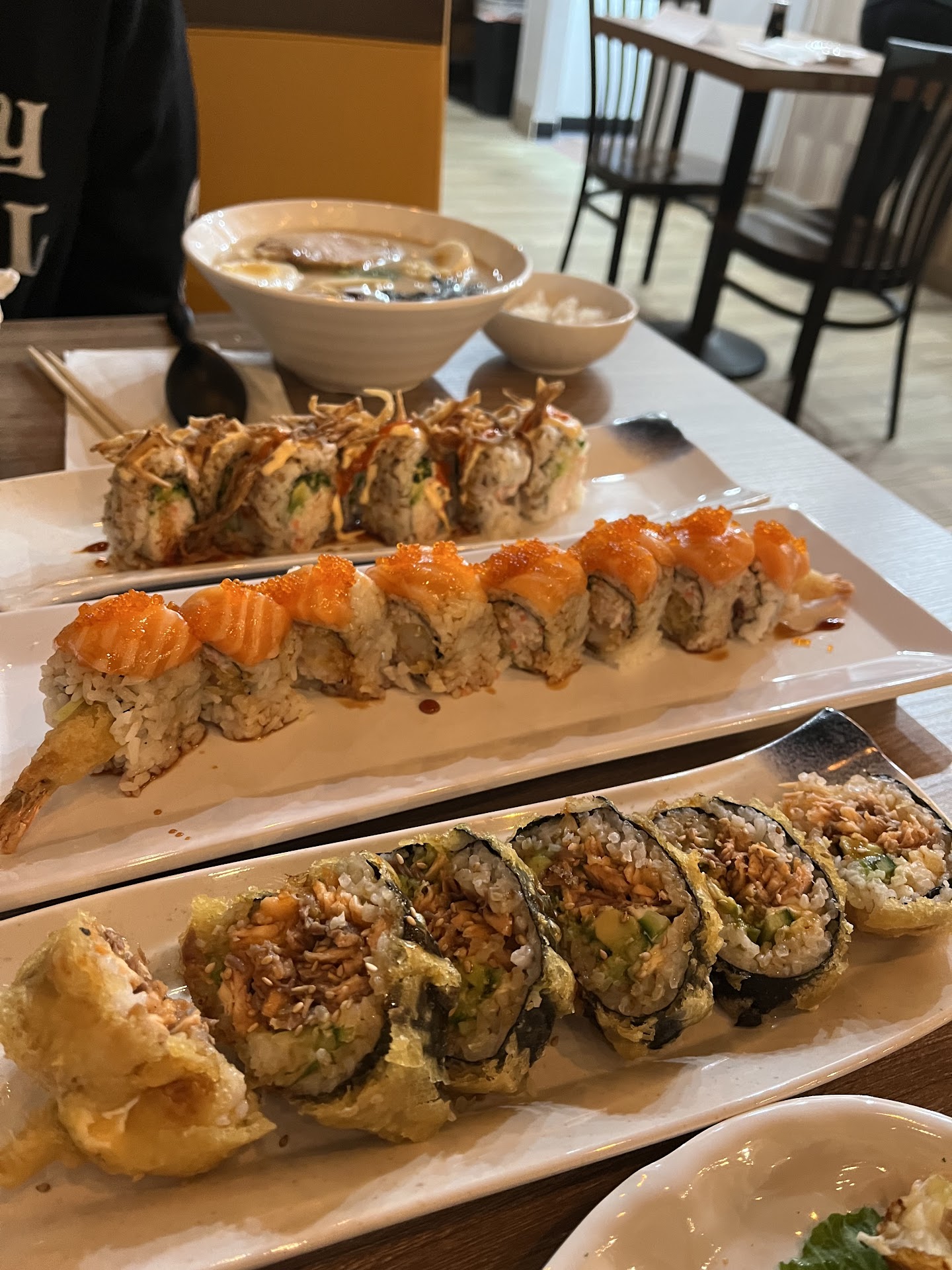 Read moreWe had a group of 4 on a Saturday night before our movie. It was busy, but we were still helped and sat immediately, which was helpful since we could have ended up running late to the movie. The waitress was really nice and attentive. We had potstickers and takoyaki as appetizers and really enjoyed them. They do use a different sauce with the potstickers than we have normally seen, but it was still good. We had 3 of us with ramen (tonkatsu, chicken, and miso) and 1 with the Las Vegas roll. We all had water, with one person having sake as well. For the two pork ramen bowls, they do ask if you want pork loin or belly, which was a first for me. I'm pretty sure this is the best pork belly I've had. Perfect ratio of fat to meat and sooooo tasty. They have lots of noodles, which I prefer over excessive broth. I'm actually not a soup person, so it was definitely nice to have lots of noodles. No bean sprouts, which was a little sad, but it was still definitely worth it. Pretty relaxed atmosphere, but quick service. I would highly recommend. If I didn't live an hour away, I'd definitely use this as my go-to ramen place. My husband considers this the 2nd best ramen place he has ever been to (he's obsessed with one in SLC), which is pretty high praise from him. Normally I'd take pics, but forgot because we were so rushed, but they did have good...