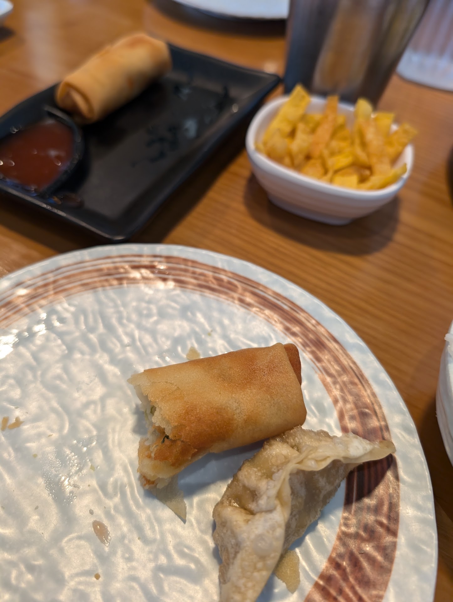 Read moreI want to start by saying I wanted to like this place because I like supporting new restaurants, but alas it was not good. Maybe it was just a bad day, but today it was not good. I am sorry I didn't take any pictures of my food because it looked great. Unfortunately it did not taste as good as it looked. My friend and I went here for their $5.99 lunch special. The special is not noted anywhere in the menu, but when I asked I was told it applied to the Chinese lunch special (Entree, fried rice, gyoza, and soup) and the Sushi lunch special (2 rolls from the list and soup). My buddy got the Kung Pao Chicken and I got the Sushi special with Spicy Tuna roll and a Vegas roll. The soup seemed like it would have been pretty good, but there was a strong burnt taste. By buddies Kung Pao likewise had a strong burnt taste to it, not just the traditional wok hei (breath of the wok) flavor. My sushi was also not very good. The Spicy Tuna was fine, though they chop up the tuna (I prefer my in chunks), but was more fishy than I would have liked (I guess that is what you get when you live in a landlocked state). The Vegas Role (Deep Fried Tempura Salmon, cream cheese & avocado, top with spicy mayo and eel sauce) was not good. I am the type of guy who normally eats everything. Even the not good stuff, but this time I left a little of my Vegas roll because I just couldn't eat any more. I had to look up the ingredients just to know what was in it. The tempura was not light nor fluffy, but dense and under cooked. I could taste the cream cheese, but that is about it. It mostly tasted of uncooked batter. I may give it another chance because the Chinese food looked promising if it wasn't burnt and I didn't get a chance to sample the Thai menu, but I do like the lunch specials at Thailand restaurant and their prices are a little more competitive. I will most likely not be back, but would be willing to give them another try. If I did come back I definitely would not be...