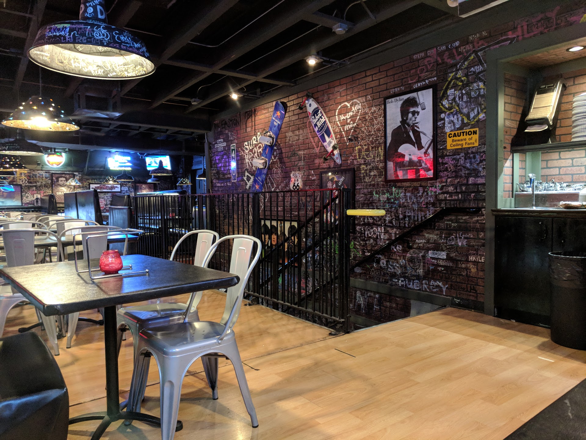 Atmosphere: The restaurant has a fun, grunge vibe. The interior brick walls have all been graffitied by patrons who wrote their names and love letters to their significant other. There's rock and roll music playing constantly with classic bands's posters throughout the establishment. It's a lot of fun if you like rock music and want a throwback to the 80's when leather and motorcycles were all that mattered.