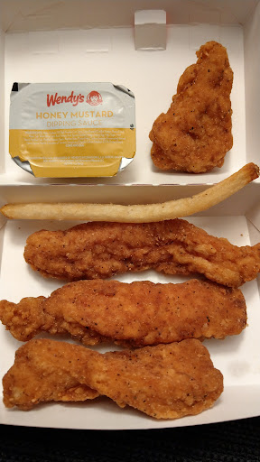 Read moreUgh. Not impressed with this place. I counted 6 employees at 6:30 pm. Long drive thru line so I went in. Took about 16 minutes from walking in to walking out with food (based on receipt time stamp and clock in car). One person making burgers, one working the front, one working drive thru, one checking DT (drive thru) orders, one walking around cleaning, then there was the manager. She pretty much did nothing! While waiting, a lady came in asking for a manager. She asked what's up with the drive thru. "We are having issues with our fryers." Lie! The fryers were just fine. I saw them used with NO issues. The lady said she's been waiting 20 minutes in DT and suggested going over to Chick-fil-A and see how they do it then stormed out. I laughed. Wanted to fist bump her. (I've seen how CFA does it and yes, it's fast and impressive!) The problem was the manager wasn't helping at all! Had plenty of time to observe to come to that conclusion. Three cars that made up the end of the line when I went in were still in line when I left. Then there's the food. What. A. Joke! The Dave's double was great. The "chicken tenders"? Yea. Look at the picture. Pathetic! Never again. $4.29 for that? So sad because I loved Wendy's but the chicken sucks now. The S'awesome sauce was...