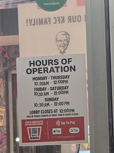Read moreIt's a combo KFC & Taco Bell, so I ordered a $5 box, which comes with a leg & a thigh (original recipe), mashed potatoes with gravy, a biscuit and a cookie. I also ordered a mini beefy quesadilla off the taco bell menu. After an inordinate wait, they finally called our number. Jordan starts munching out on his dinner and I est the quesadilla. When I'm done with that I open my box and, hmmm, what is that. They have me some chicken tenders and steak fries. I brought it to the counter and showed them their mistake. They have me a new box, which has the correct chicken pieces, albeit extra crispy, but somehow it still had the steak fries. By now we're all getting irritated. I realize we're approaching that place in food service where the staff is contemplating doing nasty things to your food. So I gently remind them that it should be mashed and gravy. They take the box, return it to me, I look in and say, "Isn't this supposed to come with a cookie?" I'm not sure incompetent covers it, perhaps higher than a freaking kite might be the...
