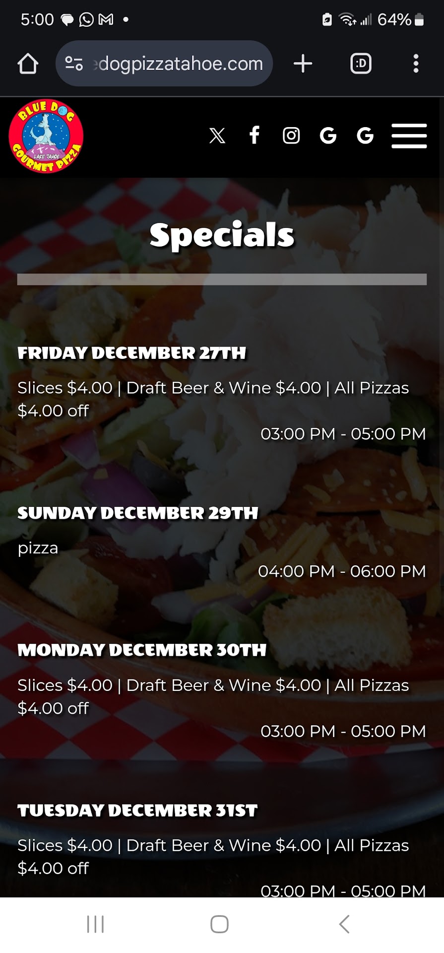The website clearly states that there is a special, today Dec 27th, for $4 off each pizza before 5pm & I asked to confirm the special before placing my order & the fella taking my order was unfamiliar with it & placed me on hold to confirm.