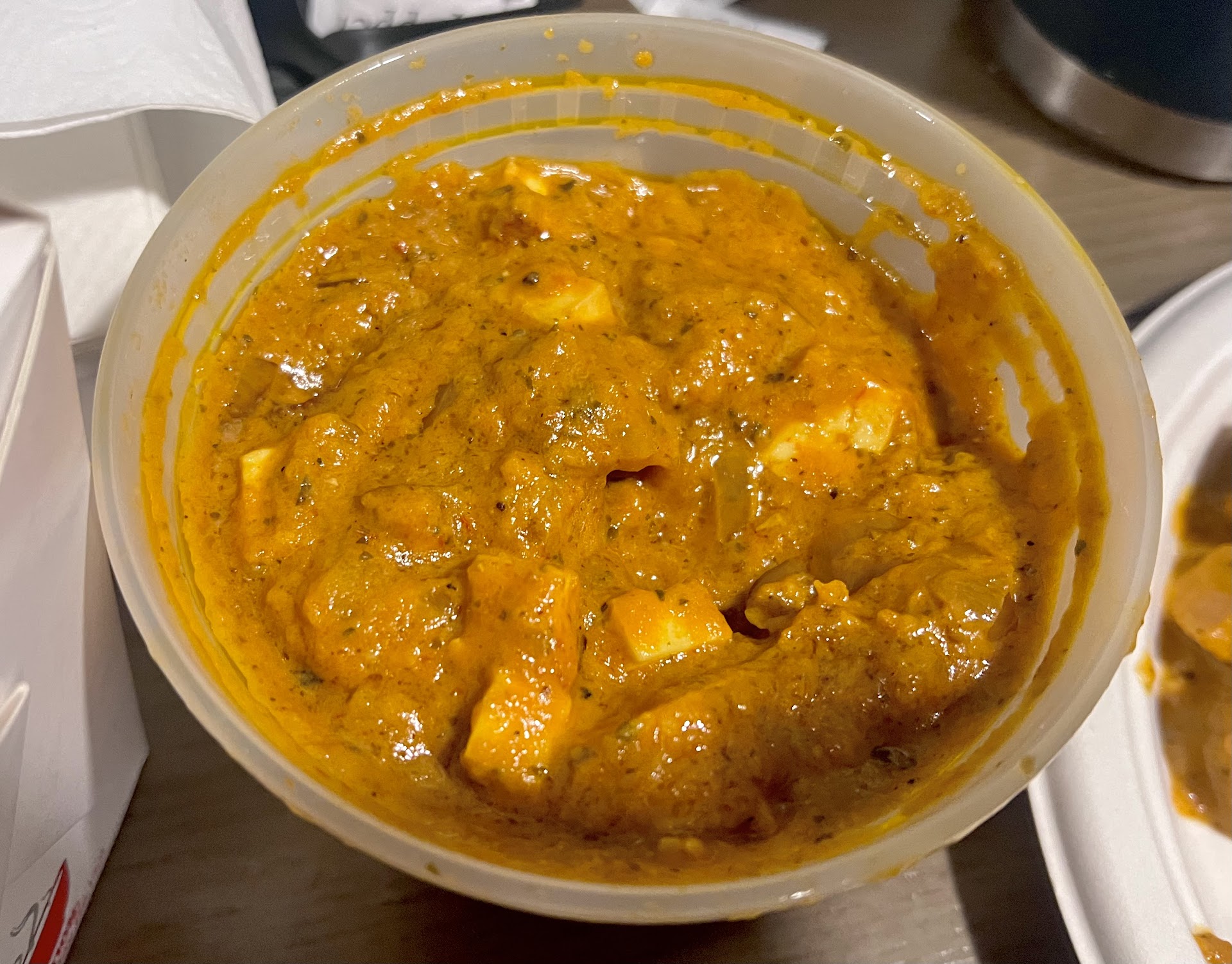 We ordered the Chicken Tikka Masala, Butter Chicken, samosa, garlic naan, and mango lassi. Flavorwise, the Tikka Masala and the Butter Chicken tastes nearly identical and not anyhing special. Flavorful enough and good over rice, but the obviously pre-cooked chicken meat was bland and it was just chicken and sauce; so kind of boring. Samosas were decent; 3 big ones for $9'ish. The lassi was also alright, but kind of gritty and that 12 oz cup was just tiny; not worth the money. On the other hand, the garlic naan was flavorful and the standout amongst our entire order; the only dish worth recommending.