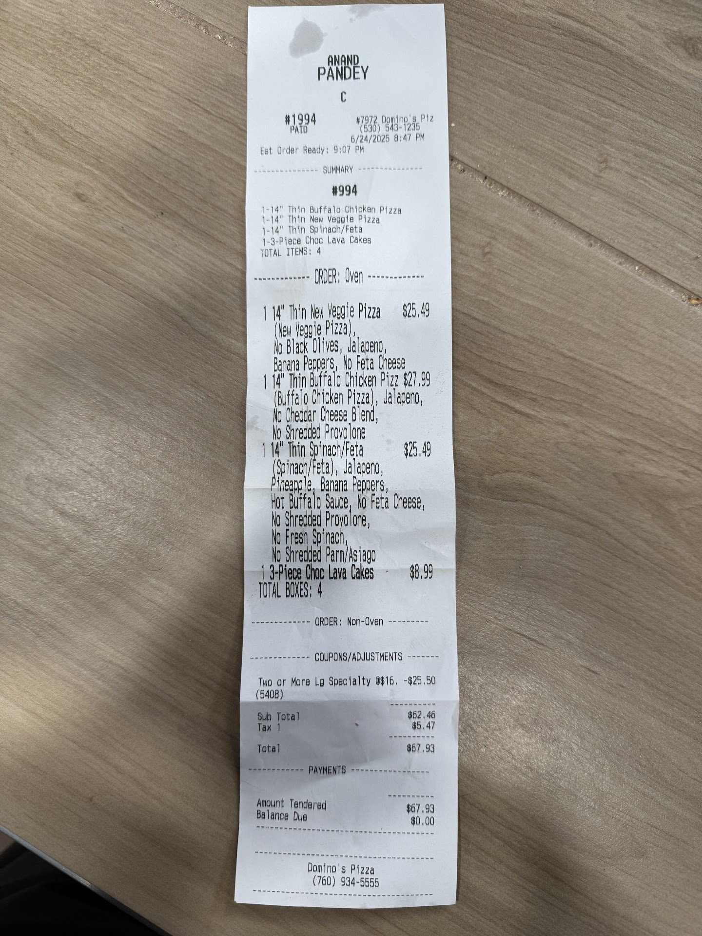 Read moreAfter a long, exhausting day driving around Lake Tahoe with family, we (four adults and two kids) decided to keep the evening simple by ordering pizza from Domino’s. I placed the order at 8:47 PM while still on the cruise, hoping to pick it up quickly and enjoy dinner at home. The order was ready by 9:15 PM, and I didn’t open the boxes until we got back.