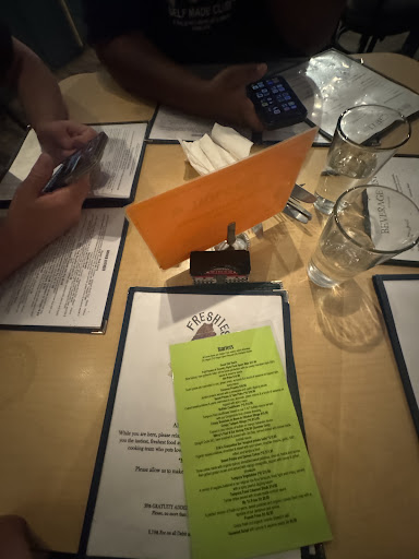 I am Freshies where to begin with my review we walked into Freshies on a Saturday night after a full day of hitting the slopes and getting some sick lines when we got there there was no line but we got the last table in the house after we got our table they turned everyone else away because it was too full we wanted to eat something a little bit healthy but where we could also get fries and this place did have salads and fries and the fries had three kinds of Of root vegetables and then you get a side of mayo and put Charlotte in the mayo to get spicy mayo but let’s talk about the ordering process before we get ahead of ourselves of one thing that we wanted was fries and it was a little confusing whether or not we could order fries or not because we didn’t sit on the menu just as we were about to thinking there were no fries anymore we noticed on the table with another little venue that had all of the appetizer options this was slightly confusing a grade and the waitress also took a while to take our order maybe because the place was full but also I maybe didn’t wink enough I tried winking and that didn’t work but eventually we got our order No no let’s talk about the Decour I would call that Hawaiian in the winter snow but if you look outside the window and squinted it was at the light it looks like you were in Hawaii however you were really in a kind of strip mall in south lake Tahoe so not Hawaii but it looked kind of like it could be Hawaii so the deck or was it was all right we got our salad and a plate of all he tuna with macaroni salad and the food was all right yeah but now it’s not about the food I think the food was pretty good it definitely hit the spot in terms of what we wanted with the fries with the three routes that was goodAnd a chop salad was well shops maybe could’ve used some protein in it but that was our fault for not ordering it yes and in the matter of the beverage so the beverage was a coconut lime aid and it was pretty lame but it was good I think it was one of the most refreshing drinks I’ve had in recent it was like drinking or cooking up with lemonade of mine in it I felt like I was back in Hawaii Crampons mails de chef PCS triste heures complements upon the chef for all of his or her...