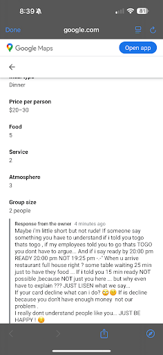 Re— the owner replied stated that we had argued. We had not, we were nothing but polite and wanted to share our experience. This is extremely disrespectful, my card was not declined. Firstly my card has worked at other establishments, instead of assuming I don’t have money. How about think that it’s your card reader or you didn’t accept the type of card I had. As I was able to pay. Instead of slandering costumers on the internet. Please read all these reviews of poor wait staff experiences and fix your staff before pushing away clients. Additionally on our ticket the order was placed at 6:45pm and was not ready till 8:15pm. Per my message above, the person said 7-8, we came in 7:30, to ask how much longer. Your response was rude and we just said ok and left. Your lack of accountability and not able to express wait times is concerning as a business owner. Clearly expressed in the way the reply was done, this business lacks professionalism. The reply is not conducive of the interactive and is confusing whether you understand what had occurred. As stated above, we requested to go and than waited an hour and a half for food. Despite being told 45 minute wait and we were more than ok with that as you were busy. I’m sorry you cannot take accountability and understand why this matter is so upsetting. Again, read the other reviews with similar issues. The food was good, but not...