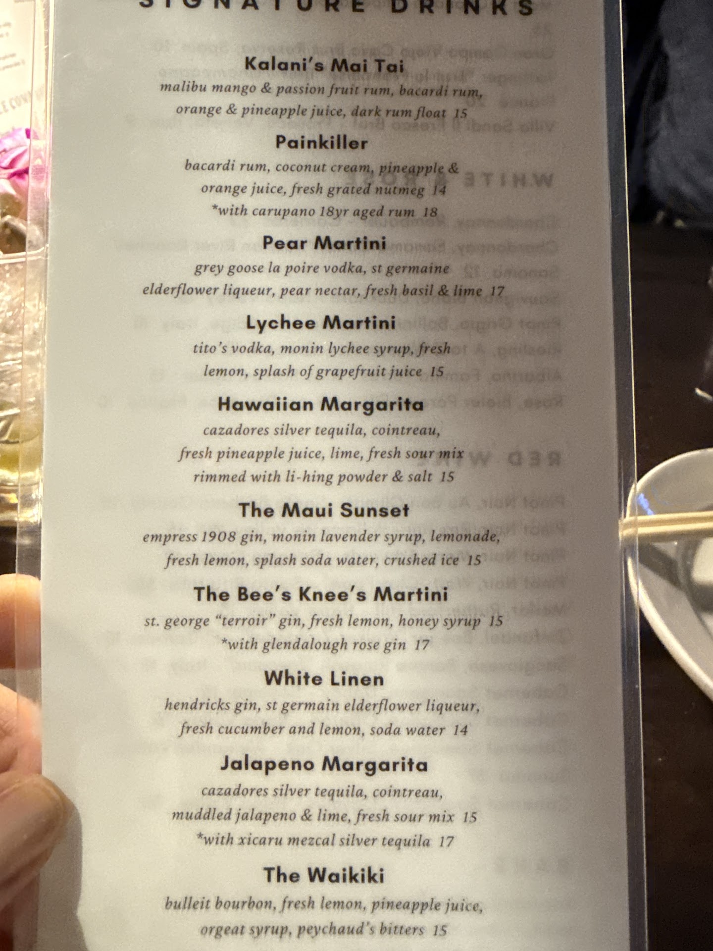 Read moreWe went to this restaurant on a recommendation from the concierge at the hotel we were staying at, and it was within walking distance and there are a lot of other choices. The restaurant was packed on a Thursday night, but had a high-top table in the bar, so we went with that. Caleb our waiter/bartender, was super. He was professional and friendly and knew his stuff. So was the young man that brought out the food (forgot his name, picture included in the review). We ordered different drinks; I had the Hawaiian Margaritta (Just average) and then the Maui Sunset (Excellent), my wife had the White Linen and the Maui Sunset and loved both of them. The drinks were well done and looked impressive. We decided to order soups and appetizers for dinner. So we had a bowl of the Clam Chowder and the Lobster Bisque, and they were both excellent, tasted fresh and delicious. And we had an order of their award-winning Wing, the wings did not disappoint. They we had an order of Fried Ahi, Heavenly Roll, and Veggie Roll. The food looked and tasted very fresh and we enjoyed it all. I ordered a Hawaiian Bread Pudding, and that was just average, but I still enjoyed it. We will...