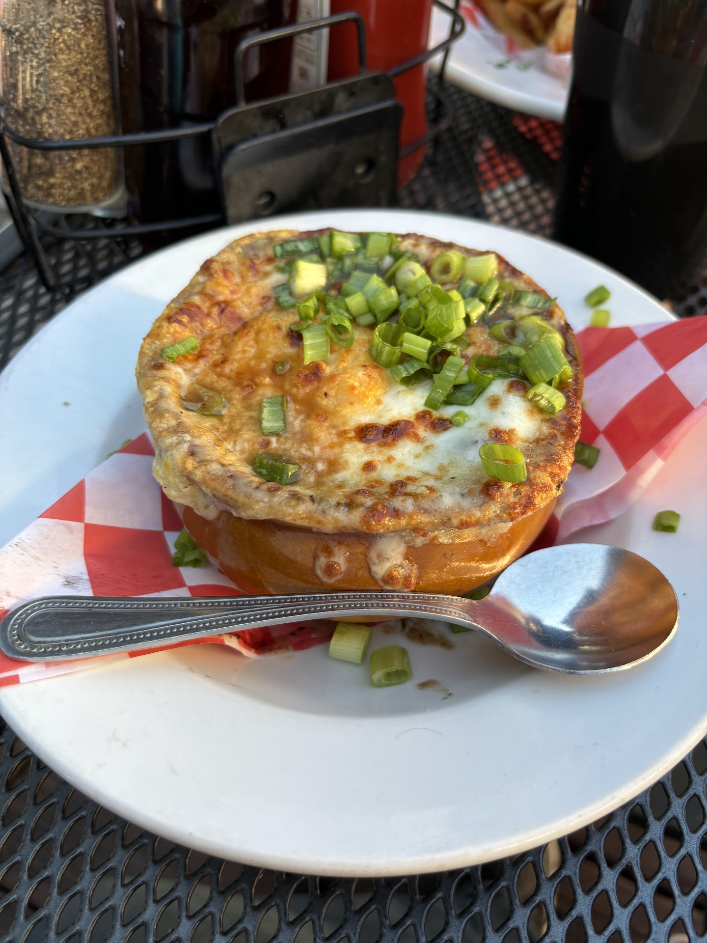 First up was their classic French Onion Soup. Served in a charming bread bowl and topped with a generous layer of melted cheese and fresh green onions, this dish was a comforting masterpiece. The soup itself was rich and savory, with the perfect balance of sweetness from the caramelized onions and a touch of tang from the broth. The cheese crust was crispy and golden, adding a delightful texture contrast. It’s the kind of dish that warms you from the inside out – a true comfort food staple done right.