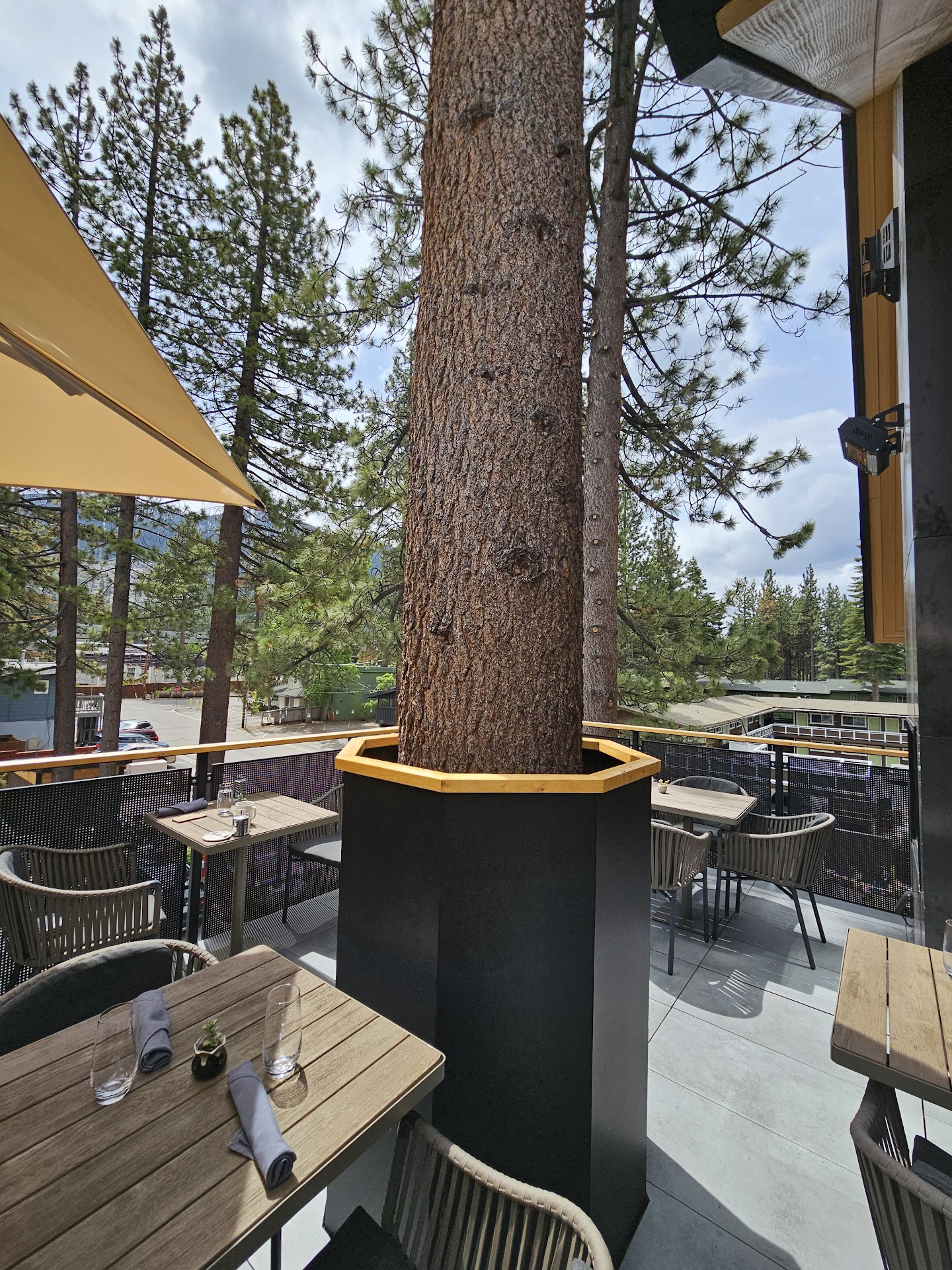 The location is unique on the 3rd floor of a small boutique hotel a stone's throw from the casinos and feels almost treehouse-like . The food in my experience has been top notch and for the caliber of cuisine one of Tahoe's best values. Really the only downside is seating space, outdoor or indoor, is limited so reservations are practically a must in the busy seasons (holidays/weekends in the Winter and most all Summer long), especially for dinner. Indoor seating is a bit cramped, or shall we say 'cozy'. The dining room is actually separated into two separate spaces. The better space is the one not accessed through the main entrance that you feel like you are dining in a treehouse with floor to ceiling windows. They have a brunch menu every day instead of separate breakfast and lunch menus.