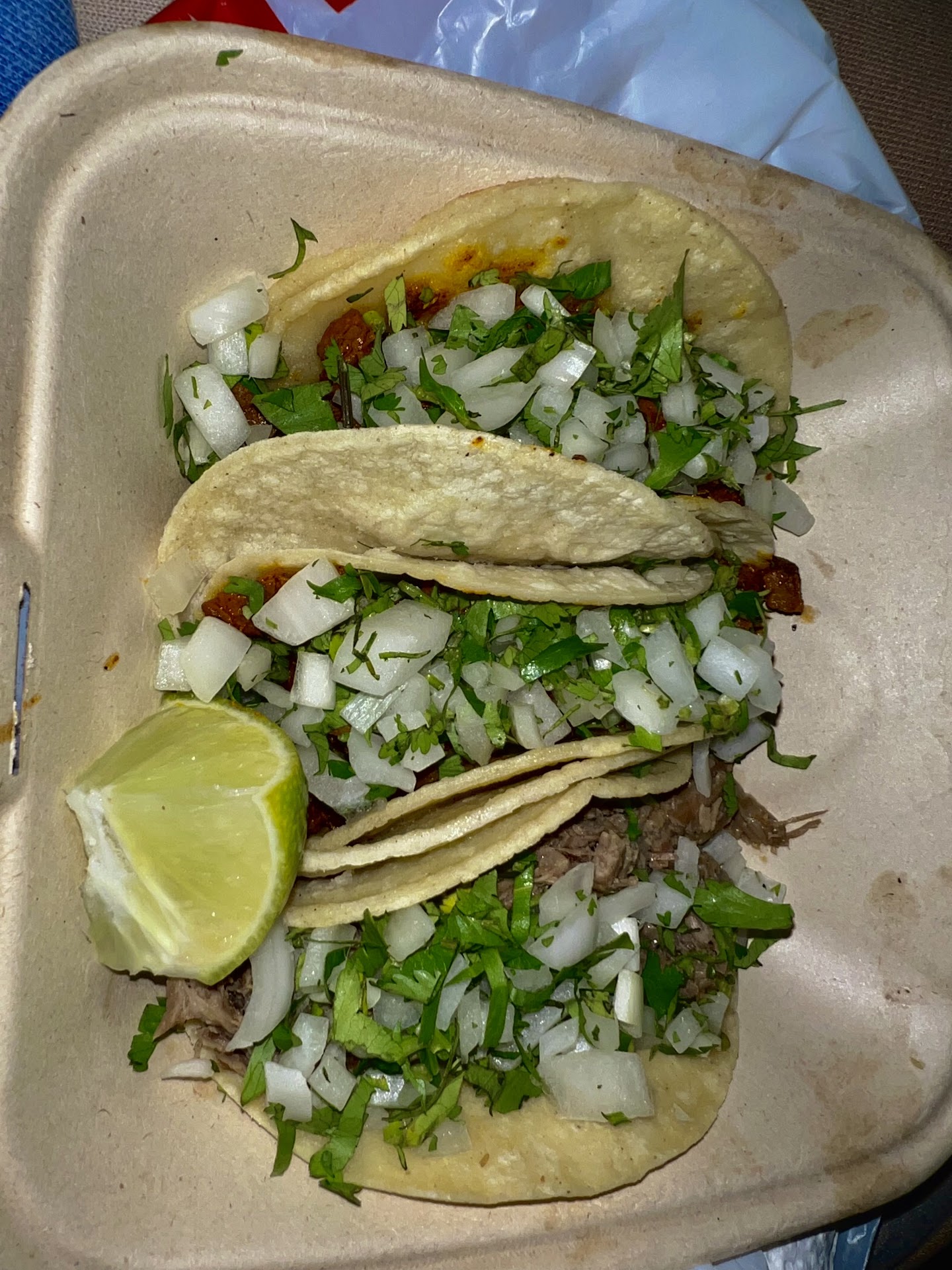 I'm literally at this place right now and finished my favorite order of 3 chicken, 3 beef tacos. It also comes with beans and rice. In this video he said he wished there was onions and cilantro in his burrito, but I wonder if he just didn't notice the bar they have with fresh cut toppings to the right of the front door.