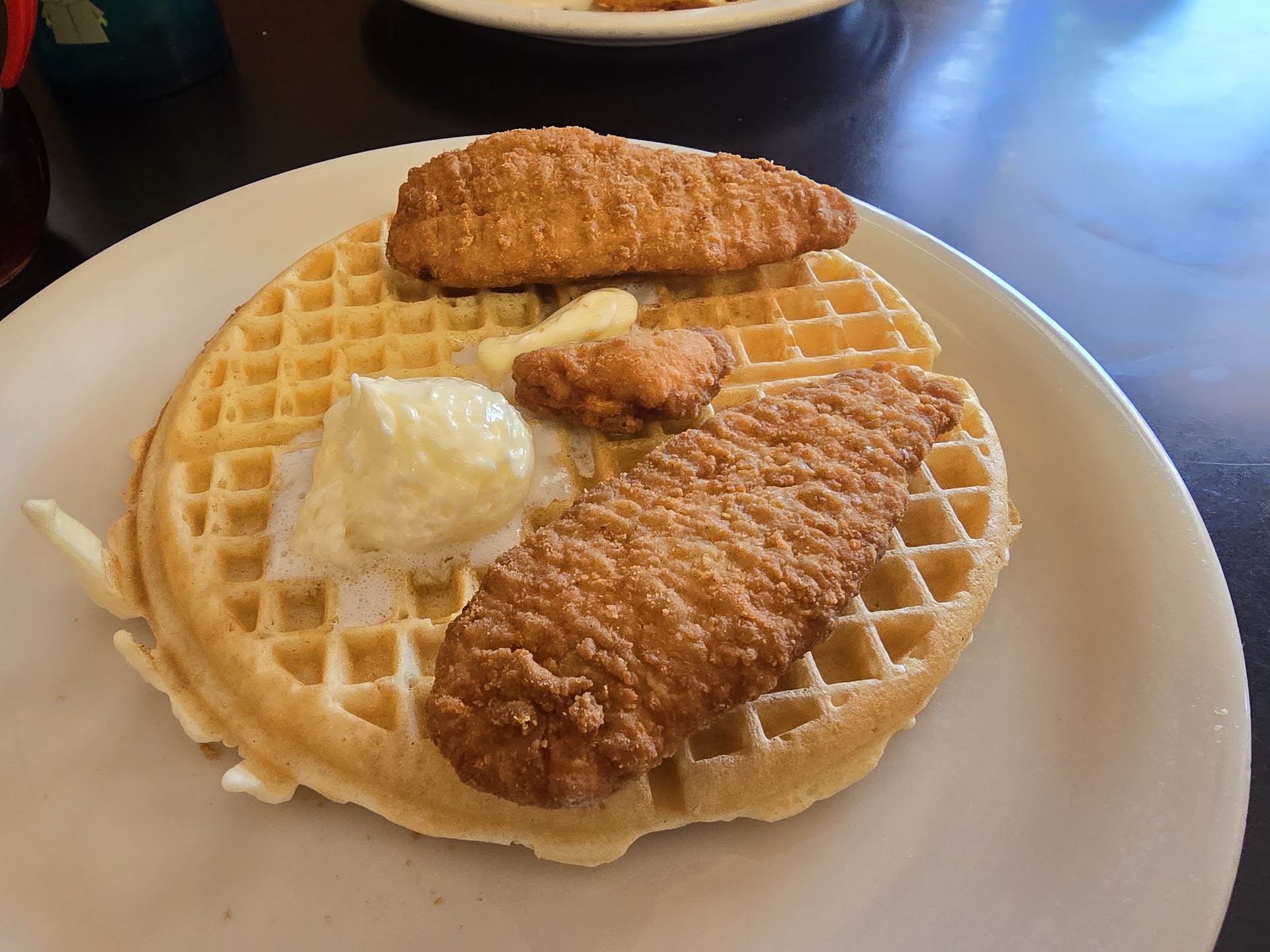 Food: We ordered Chicken & Waffles as well as a simple 2 egg breakfast that had the hashbrowns as well as biscuits with gravy. Now, I cannot stress enough that the waffles were beautiful (taste-wise), chicken was standard (albiet smaller in size than expected), eggs were good but what stole the show was the biscuits and their gravy. We never thought that the butter-laden biscuits with really simple gravy would steal the show. It really put the smile on our tired and still sleepy faces. Highly, highly recommended people!