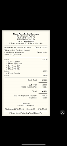 I've got ten plus years experience in the coffee industry and Three Pines sets the bar for what you should expect from a well cared for independent coffee shop. The shop was well maintained, the aesthetic was bright with touches of earth tones, and the espresso bar was immaculate at all times. It's pretty clear the folks at Three Pines care greatly for the environment and product they provide. Do yourself a favor, if you want a quality coffee experience visit the folks at Three Pines, Tahoe should be honored to have them.