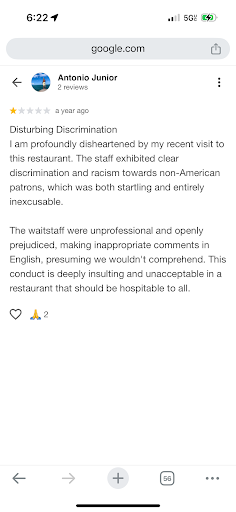 The management needs to take immediate action to address this issue. It's crucial to ensure that the staff are trained to treat all customers equally and with respect, regardless of their nationality or race. Such discriminatory behavior can severely tarnish the restaurant's reputation and deter potential customers.