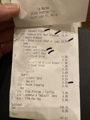 Read moreUPDATE - The manager contacted me, and bent over backwards to make things right. We did try their food again, and it was MUCH better. GREAT responsiveness is a mark of a good restaurant, and they will be addressing their training issues. No one is perfect, but they sure tried to make it so. We will be back!////////////////////////Original post - First time at this La Marsa, and first time I've ever been disappointed at any La Marsa. The tabbouleh looked like it was many days old, and tasted the same. Never EVER have I been given tabbouleh anywhere that didn't seem really fresh. This looked like cooked spinach. Rice was blah (just regular white rice, with some almonds?), far too many raw onions were all over the dish (carry out), lamb chili had an odd vinegar taste, and the garlic sauce was MUCH more bitter than I've had at many other Mediterranean places. On the other hand, the employees were friendly, the lamb was tasty, and the vegetables they grilled were very nice. But I don't think...