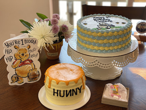 For my daughter's first birthday I went to South Lyon Village Bakery for her specialty cake. I asked if they could decorate a cake with "Classic Pooh Bear" on the large cake and make a "Hunny pot" smash cake based on a few photos I found. They went above and beyond and did an amazing job! And - the cake was delicious! We went with the whipped buttercream frosting, white cake, and raspberry jelly preserves as the middle layer - delicious! Everyone at her birthday party was amazed with the cake and thought it was very cute. Great communication on the design, ready to pick up on time, and a great price. Thank you South Lyon Village Bakery for the amazing cakes and always fantastic doughnuts (apple fritters are the best!) :) We'll be back again for cakes...
