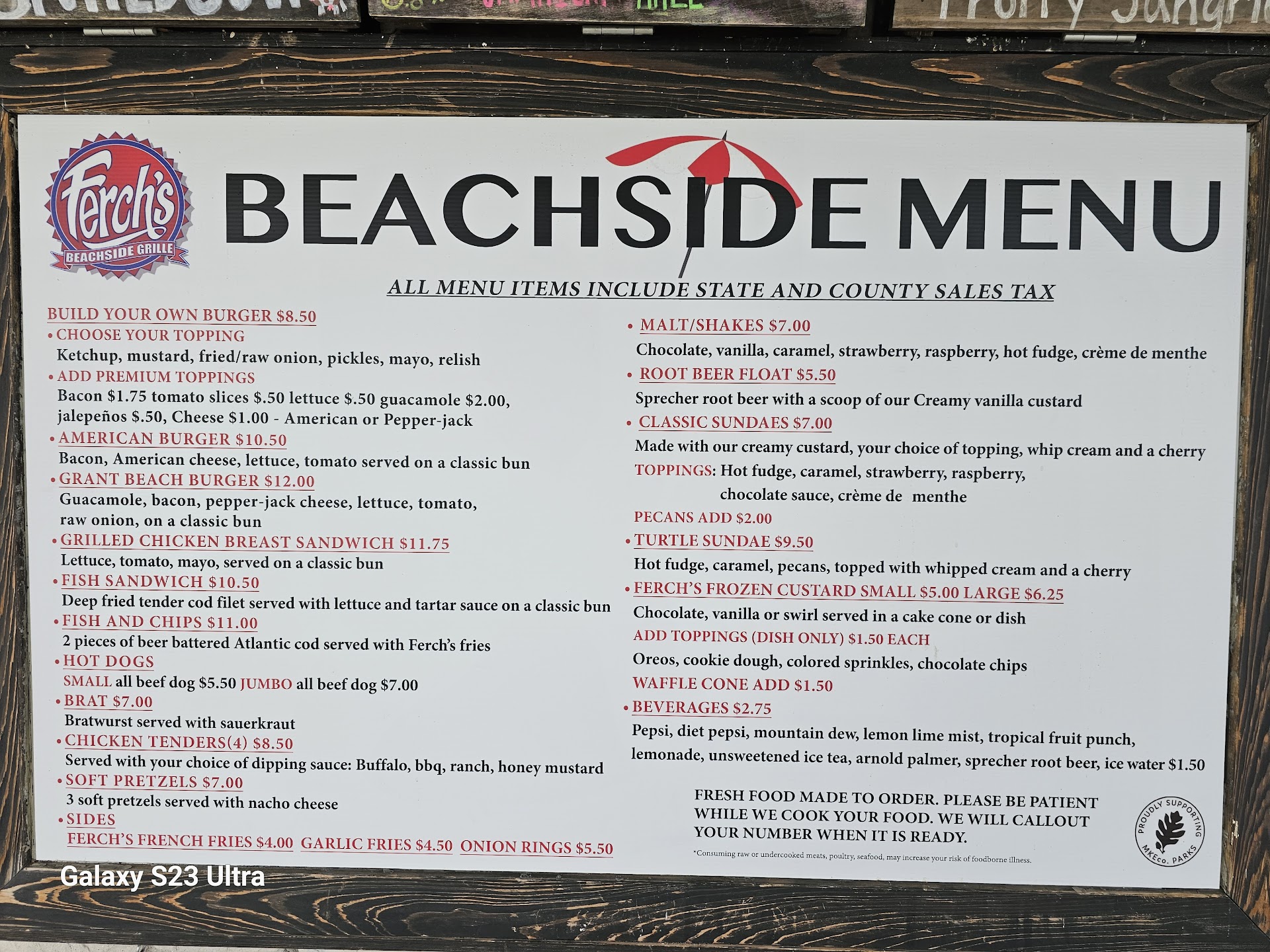 ย ย ย Read moreMy children and I love having beach days at Grant Beach Park. Although we always bring our own food to snack on, we always end up getting something from Ferch's in addition. We usually get fries and custard, which have always been good! My daughter isn't a fan of the cookie dough topping option, but of course, that is subjective ๐. Today my youngest and I were at the beach and we decided to get an American burger (burger with bacon, cheese, lettuce, and tomatoes), fries and soft pretzels (order comes with 3) with cheese. (First time for the burger and pretzels). The pretzels were what you would expect for a basic soft pretzel and cheese dip option. I personally didn't care for them but my 4 year old was happy. (Happy kiddos, happy mama ๐) The American burger was really delicious and exceeded my expectations lol. The fries are a generous size for what you pay for it and the burger was also massive as well. Also, a plus... they have Sprecher Rootbeer as a fountain drink option ๐. Overall, we were happy with our food and I must say, the service is always wonderful, especially today. Everyone was smiley and happy to be there, which I appreciate greatly since good service is hard to come across nowadays. From one local restaurant owner to another, Ferch's, thank you for providing tasty options for beach goers with great service. We really...