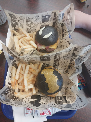 I dined in the other day, and was more than a little disappointed. Let me start off with the positives; the atmosphere and display of the store is great, filled with nostalgic movies, memorabilia, even a couple arcade games. It's small, but I think they do the most with the space they can, and still allow an adequate amount of dine-in customers. The woman who was checking us out was pleasant and seemed to be in good spirits, which is always nice when dealing with customer service. I also appreciated the canned soda (I personally think soda is best in a can). Now to more somber reports. The burgers are advertised as "comic themed" on all accounts I've seen, and are based on certain comic book characters. I ordered the Symbiote: a burger themed after the Spider-Man villain, Venom. However, after waiting on around 45 minutes, my girlfriend and I were disappointed to receive plain looking burgers on sesame buns. The burgers were fine, but without the colorful bun, nothing to boast about, particularly when I bit into a piece of bacon fat nearly the width of the burger. The fries were also a disappointment. From the small advertisement we had, the fries appeared to be thicker potato wedges, but instead were plain-cut, little thicker than McDonald's. Visually, they were seasoned in something, but palette wise, it was hard to tell. Despite all this, I realize that it was perhaps a busier day than they were used to; as I understand it, they have only been open a couple of months, and there was a larger family gathering taking place at the same time. It's entirely possible that they ran out of buns and had no choice but to resort to plain sesame buns. That being said, I feel that is something that needs to be displayed at the counter, either visually via sign or verbally. After paying and leaving a four dollar tip, a total of $30 and about an hour of time, it's discouraging to not receive the gimmick you wanted, and settle for an...