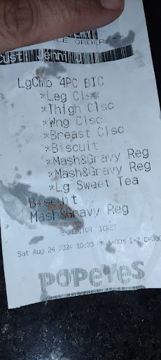 Read moreSomething fishy going on with Drive Thru. Tried ordering in the app but couldn't enter coupon code. Let them know I had a coupon was given a total that was $2 and change over amount on receipt that I asked for. Cashier tendered coupon and senior discount that I wasn't sure if I qualified. There weren't many options for sides except salty, mostly coldish fries while waiting for fresh bone in chicken to cook. Chicken was good but would be even better with desired sides. That's when I noticed/extra e discount and getting charged one thing and told another. The next day I explained the evens and asked if there was a Manager or shift lead. Was hung up on twice trying to call order in earlier That day, because the food was purchased prior to closing.We were there about twenty minutes to twelve.In the afternoon After going unnoticed inside the restaurant, everyone from front of house and back a house came to speak to me, What took about 20 minutes to fix could've been done in one trip. My main concern was being shortchanged, and the fact that there was like not much and the area of sides to go with our meal. While visiting my mother in the hospital, I lost my wallet and was dealing with trying to recover cards and stuff like that.I had a limited amount of cash on me. But it didn't change the fact that I was hungry for popeye's chicken biscuits, red beans and rice and macaroni and cheese. All I got was chicken and biscuits and taken advantage of for over the amount that was due for the meal. I'll change this review if things are changed. When I go through again or when I order to go pick up because the location south of costco on wall is superior to the one in ogden. It wasn't about a money thing, but it was about a food thing. When I was hungry, I wanted chicken. It had to be made perfect was fresher. That way, but we just sat there and eight cold greasy french for his because I didn't want to have a headache and get sick. I'll take this down. Yes. Things have changed.Then you should be able to tell like, right when you get up to the drive through window...