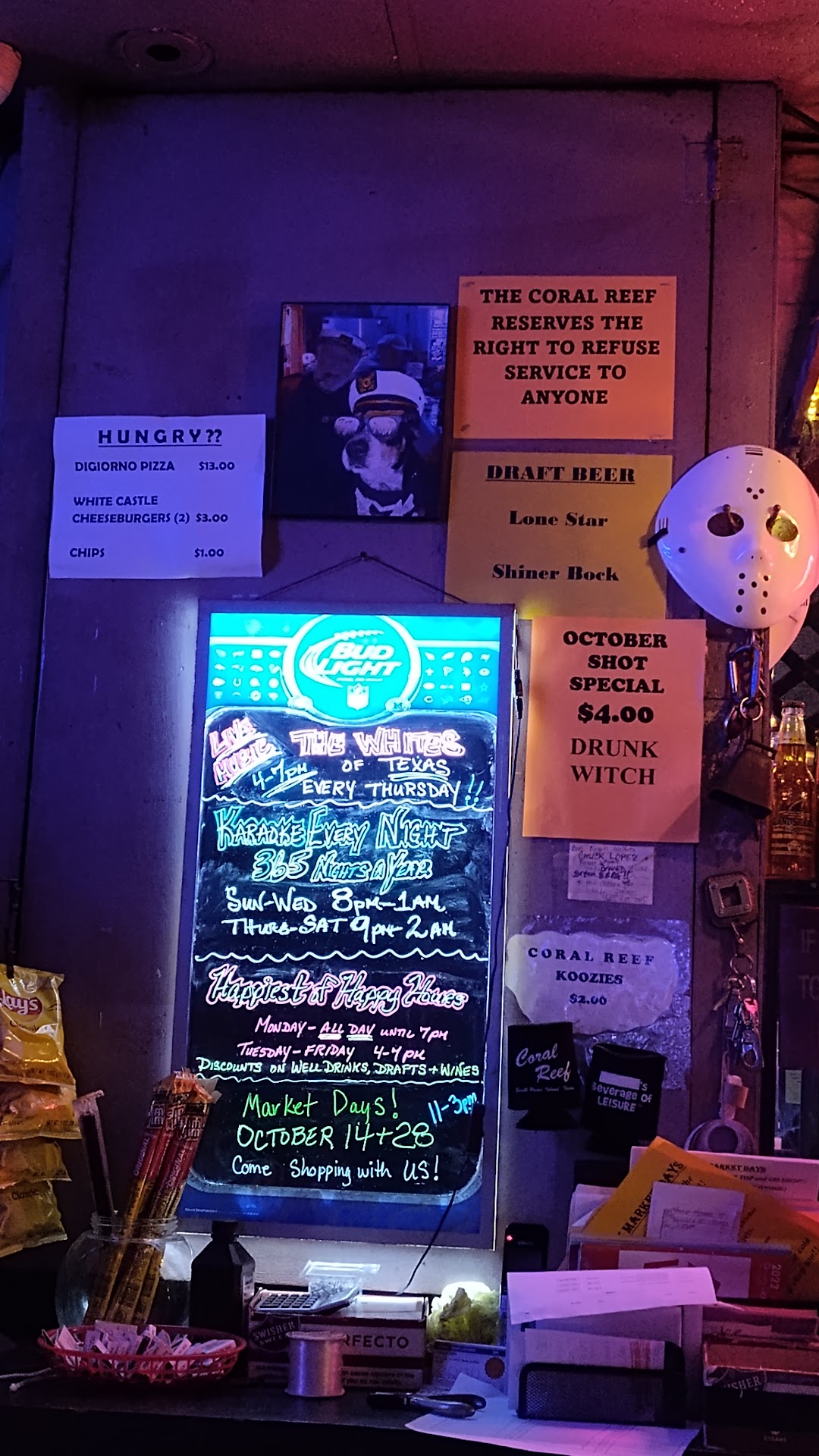The random conversations being had in this bad were metaphysics, spirituality, Angel numbers, football, love, disability, body autonomy, love and loss, dogs, camping, energy, tarot, astrology and karaoke and bonfires and travel and music all types from country to rock to Adele top 40 they played it all. I have a support animal and no one was weird about it. The parking is limited but there also street parking. Wheelchair access might be difficult because it is on a slope however a standard chair could access the side door if not the front door. Stalls were narrow and sideways doorways standard. They sell pizza white castles and the space looks older but it's a great dive bar feel. It has the vibe of when Peggy Sue got married heroine Peggy Sue ran away with the beatnik she ended up there. I love it. Plenty of picture opportunities and sports music and memorabilia as well as meme worthy signs on the walls everywhere. The kj and everyone in the crowd was super sweet and supportive of both myself and my support animal. I wasnt questioned and interrogated about his paperwork either because who actually carries it around when we all barely remember to not forget our keys and phone to begin with. I loved this spot my tab was about 10 for 2 non alcoholic beers as micheladas. The bartender and the crowd has the humor of an army veteran the Ramones and Bohemian hippies made into 1. I literally met a gypsy a realtor a firr dancer and a couple from the Midwest and California who shared their stories about cancer related losses. And all these folks were the local regulars. The island itself has a very heavenly vibe you can see everything from every income bracket every country coexisting very lovingly and peacefully here. Love this spot. They have karaoke every night of the year and a wooden patio out front to have a smoke or enjoy your drink watching the star filled sky in the breeze under the...