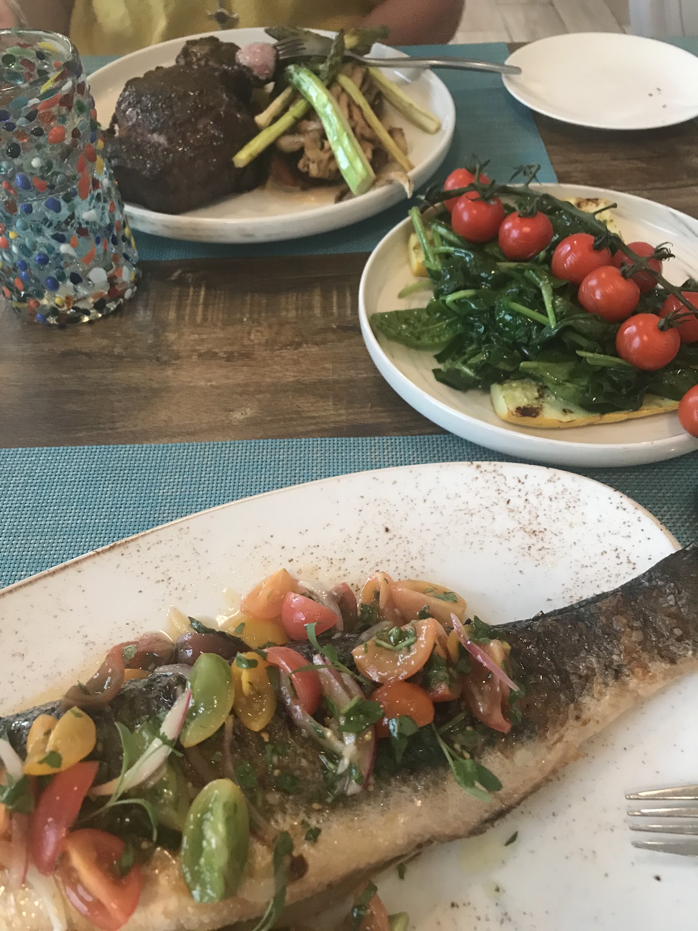 The evening's entrees included the 18 oz ribeye a whole branzino. The steak was grilled to perfection, served at precisely the right temperature. The branzino was stuffed with lemons, herbs, etc. that highlighted the freshness of the fish. Both entrees were fantastic!