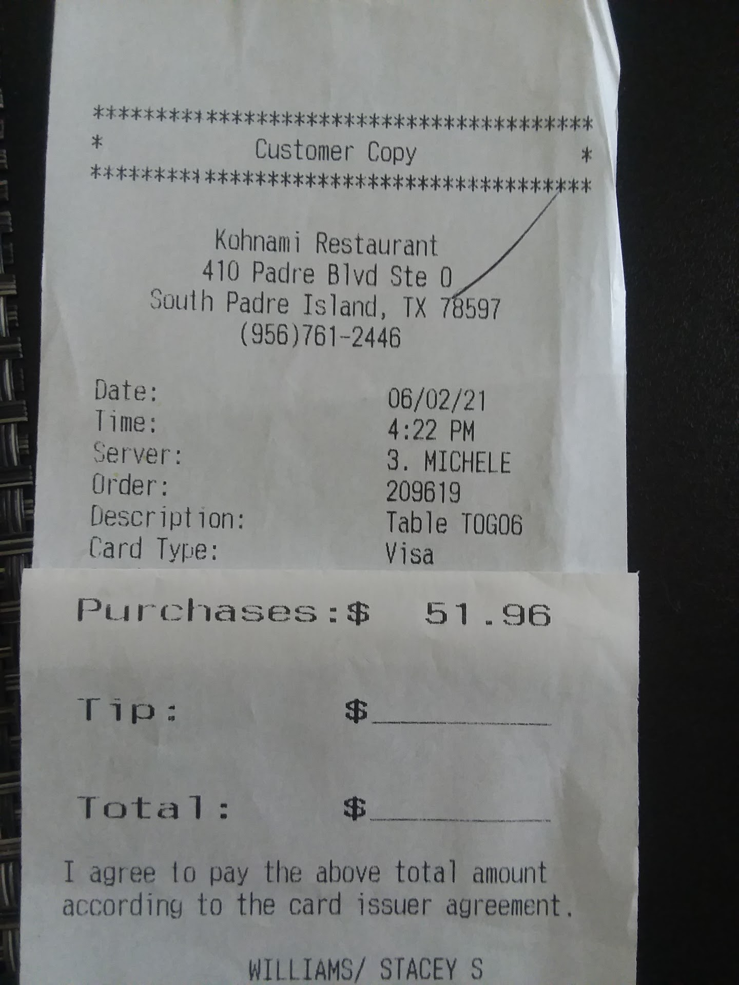 Terrible food, terrible service. We are Asian so we wanted to have some Asian food after several days in south padre, we saw Kohnami on our drive to our hotel so we decided to give it a try. The place was clean and we were amazed they had Chinese and Thai food on their Menu. On our first visit our Waitress was extremely helpful, friendly and very knowledgeable about the menu items. She guided us thru what would be good for my elderly parents. We ordered 3 orders of Shrimp Red Curry and an order Pad Thai, even though the taste was not good, the waitress attitude compensated for it. Then next day after a long day at the beach, we all decided to go back and have some comfort food, for Asians its means Rice and soup. First of all we were greeted by another young lady who almost from the beginning made us feel as if we were giving her trouble by coming to eat in the Restaurant, so after a long wait she came and handed us the Menu and didn’t even ask what would we want to drink. My husband had to wave her down and ask her for some water. After a long wait she finally came to take our order, we ordered couple of Sushi Rolls as appetizer and three Pad Thai and one Beef dish. We requested the Pad Thai to be combination of Pork and Shrimp, so another 15 min goes by and she comes back and tells us, oh sorry my owner said we cannot do Pork and Shrimp, for that we said ok then let’s just do chicken and shrimp, which is extra $$.We wait another 20 min and by this time my Dad is getting impatient since he has already taken his before meal Med, my husband goes and find the waitress and she finally comes with out appetizer, and another long wait and finally our food arrives, the minute we all tried our first bite we realized the Pad Thai was extra Sweet, it tasted like noodles rolled in Molasses, so my parents wanted to order something else to eat since it was too sweet. We ordered Tofu with Red Sauce Curry with Rice, Which of course took another long wait and when it finally did arrive, there was no sauce and the tofu tasted very very old, So I went and found the waitress and requested her to see what she can do about the curry and her answers were, "its that way I didn’t cook them", and she rolled her eyes at us. I was appalled by the behavior of the waitress and the Japanese Owner who was standing near by watching the whole thing, didn't step in to correct the situation. I am very upset but my husband said lets just pay and leave and find somewhere else to go and eat. So we paid our bill left all the unfinished food there and left and had pizza next door. They were so rude that they didn't even as us what can we do to make it better for you. They are very arrogant since they think they are the only good asian restaurant around there, but they forgot that they just lost a customer. So if you are really looking for crapy food then why waste over $120.00 in this restaurant, its better to get a burger at...