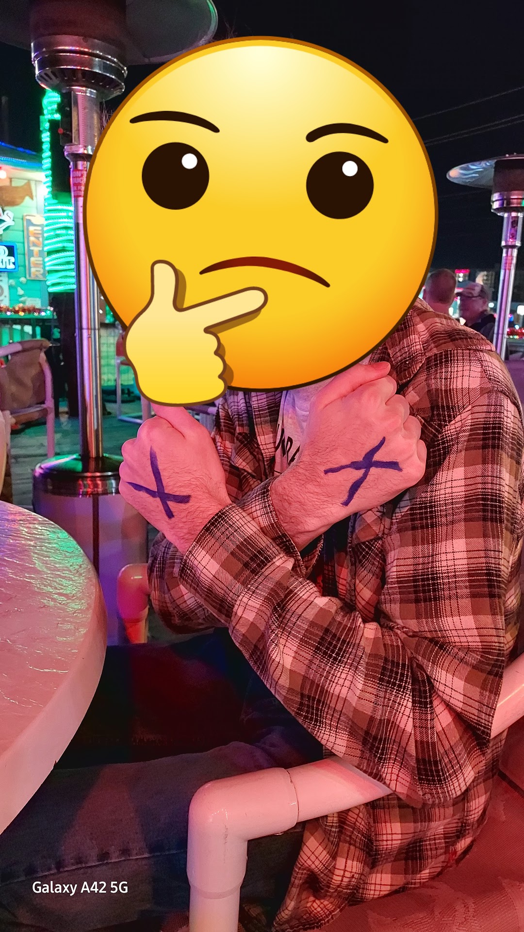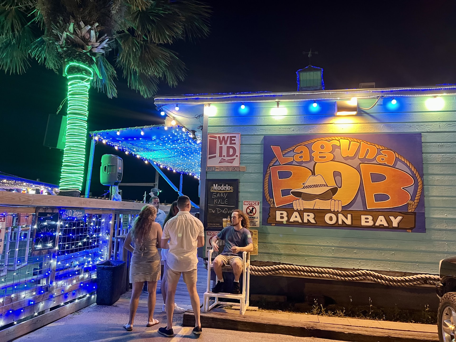 Read moreStopped in to Laguna Bob's for dinner at 7pm. We could hear live music from the street. And we love live music. Wife and son ordered burgers that they both enjoyed. I ordered the peel and eat shrimp. It is nothing more than shrimp cocktail on a platter. The menu describes it as seasoned, but not sure about that. After we ordered a employee approach our 20yr old son drinking his Coke and checked his ID. No problem as the sign reads We Card Everyone. Then the employee proceeds to mark both hands with an X in permanent marker. Big enough to signal incoming helicopters safe landing. We watched as all X applications are corresponding to hand size. Maybe get that employee a magic erase board to practice his street graffiti on. Not paying customers before the 9pm bar...