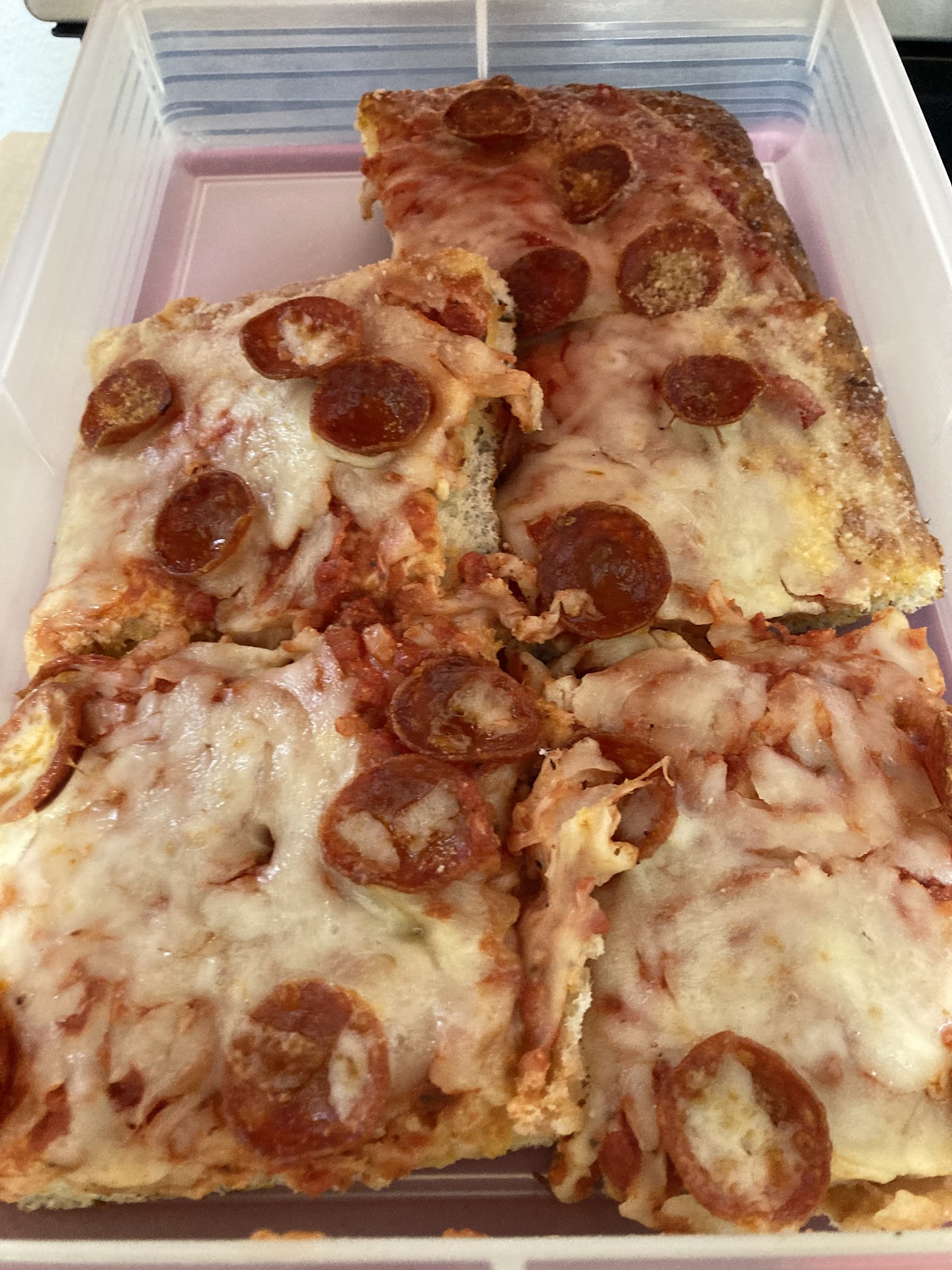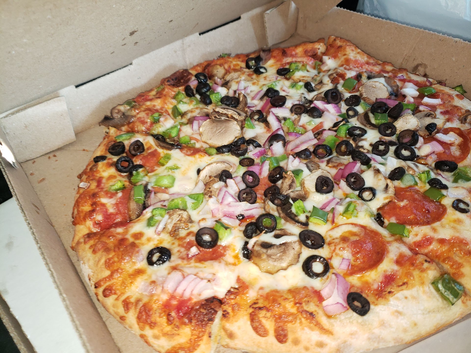 The pizza was great. What was probably most notable was the crust -- it had a nice firm outside but soft and fresh in the inside. They put mushrooms in my order by mistake, but I just decided to remove them by hand since we live far away and I didn't feel like creating a fuss. The cheese blend is also very nice.