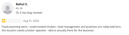 You also stated that “no one has definitively proven that food from our location gave them food poisoning.” That claim is simply not true. A quick search of your Google and Yelp reviews reveals multiple complaints of food poisoning, undercooked chicken, moldy food, and even foreign objects in meals—some with photographic proof. One reviewer even reported food poisoning twice. These are not isolated incidents but a clear pattern of food safety failures.