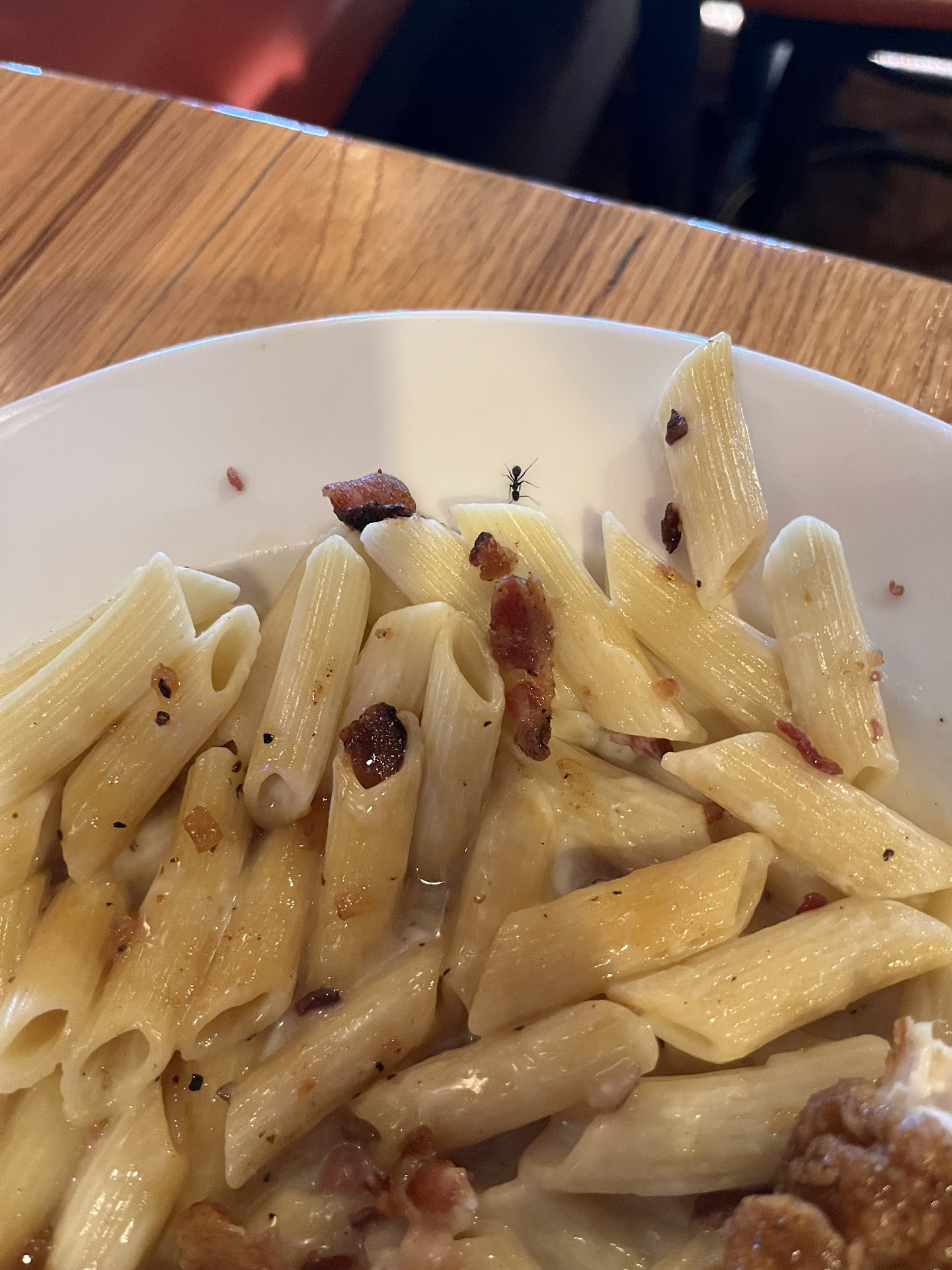 If the photos don’t tell you enough let me just tell you about my experience on Easter 2024 at the South Portland Applebees. From the moment we walked in I could tell this was gonna be an experience for the ages. Out the gate there was few tables with people sat yet there was a 15 minute wait when we arrived and people already waiting in the lobby. Having already called an hour early to check if that was the case and being told it was not busy me and my people promptly waited in the car. 15 minutes later we finally walk in and find our cute little spot at a table right adjacent to the bar. Ordering drinks, it was hard not to notice the 5 employees walking around doing nothing while the lone bartender was left to prepare all the drinks by his lonesome and not just the drinks for our table FOR EVERY TABLE. Better yet they also made him buss all of them to each table despite the poor guys limp. Drinks came not too long after they were ordered, perks of siting near the bar. The drinks were actually pretty good I enjoyed my freezy drink and my epic blue Mountain Dew and my dad was quite fond of his funky alcohol drink. The food however ohh ho hoooo that my friend is another story entirely. Ordered shortly after our drinks had been had my dad ordered the salad, I ordered the buffalo chicken, and my poor girlfriend decided upon the macaroni and cheese more on that later. About 35 minutes or so go by of us waiting and jesting about the current goings on when finally our food comes out and just wow I wish I woulda taken some good pictures. My father said the salad was fine, unmemorable but fine. Upon receiving my ceramic boat of buffalo chicken tenders I was over joyed and with a big smile I took the first bite. One word rang through out my mid at first taste… TYSON though I could hardly complain especially compared to the disaster piece they served my sweet girl. The Mac and cheese. A bowl of penny pasta sprinkled with Parmesan, bacon bits was placed in front of her and after a few bites it was clear that wasn’t all this plate had in store. Out from under one of the noodles crawled a black ant. A horrified look came across her face as I looked over and began to laugh hysterically as my table slamming caused the pool of liquid in the dish to slosh about. 20 minutes and 120ish dollars later we left and as unmemorable as my fathers salad was I just must say I very much enjoyed my goofy silly time at Applebees on...