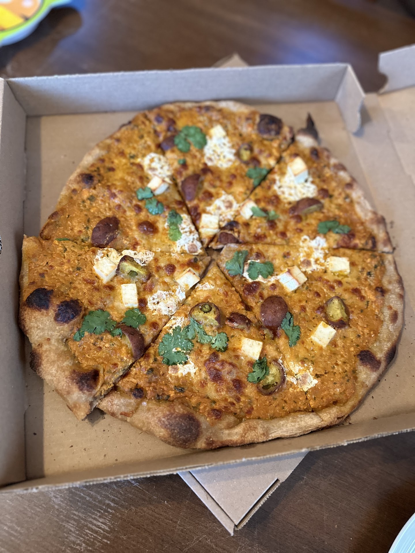 We had one pepperoni to try as a baseline and the Taj Indian pizza for fun. My husband wanted more spice on the Taj but it was great for my spice sensitive buds.