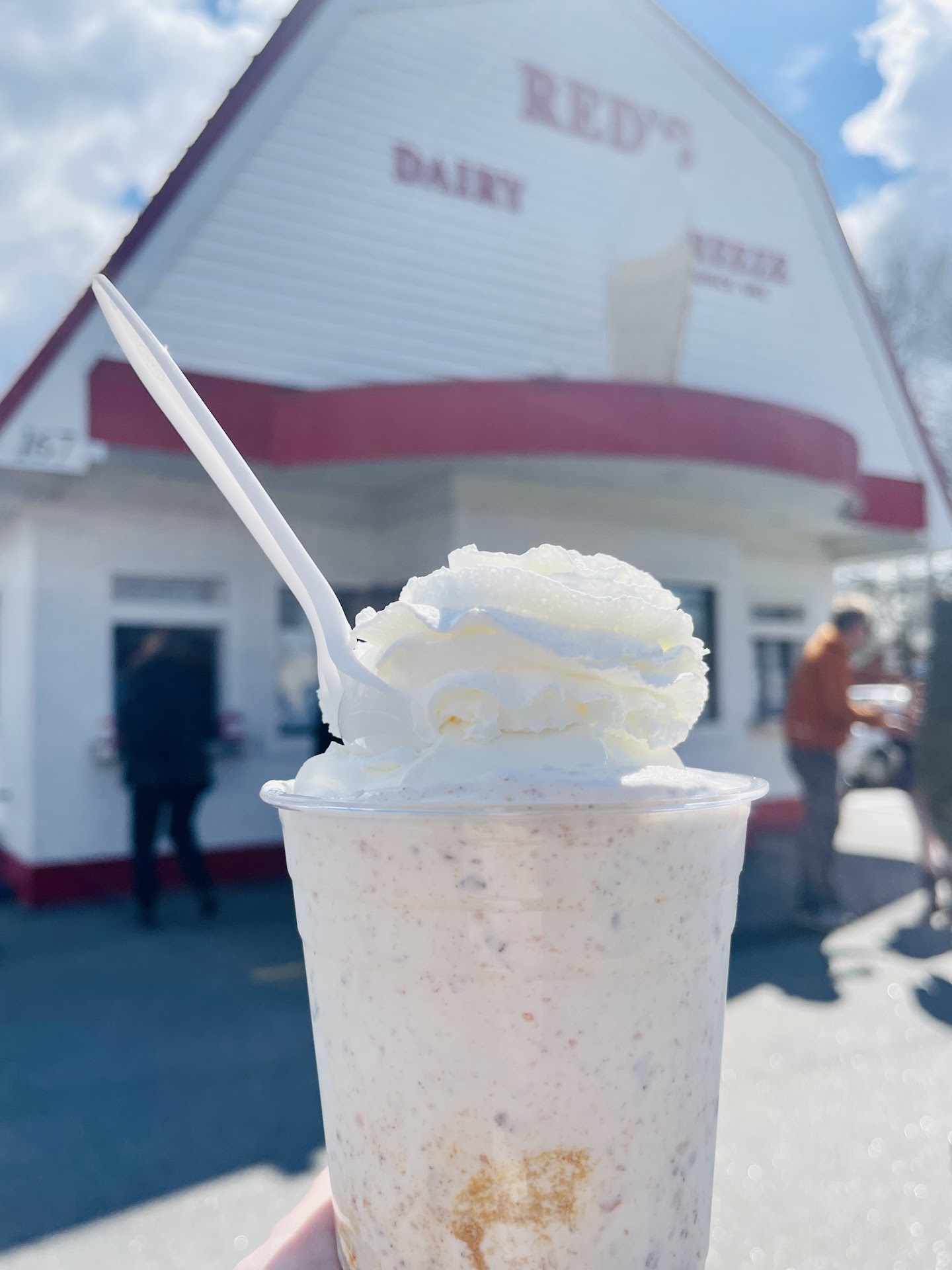 Read online about their "Boston shake" which turns out is an off-the-menu item, but totally worth trying. The cashier was so friendly and patient in explaining the "Boston" is your choice of shake with a soft serve sundae on top. I ordered eggnog shake topped with salted caramel soft serve and fudge syrup. With over 20 shake flavors and 10 soft serve choices, mix and match how you want.
