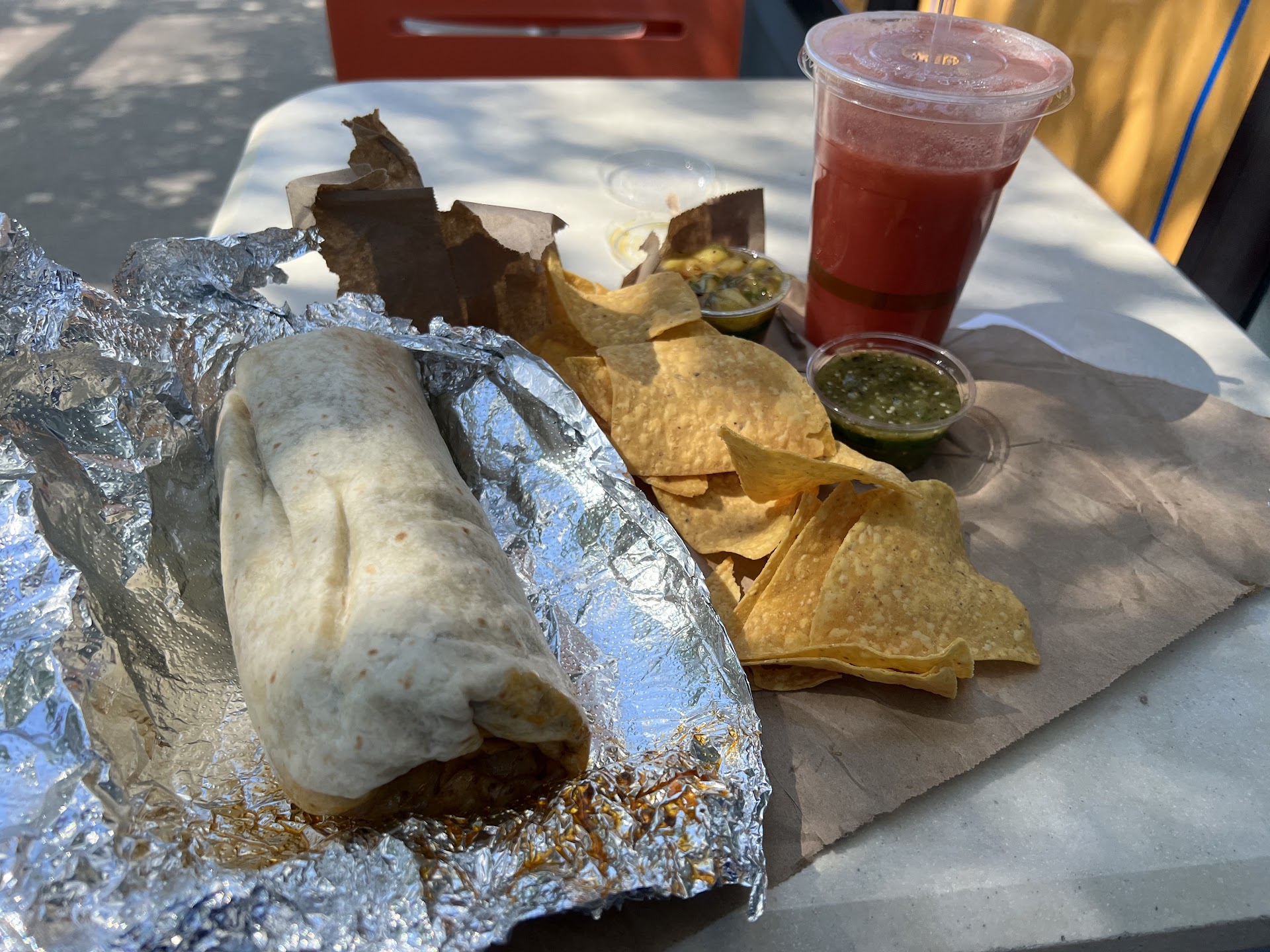 Great flavors brighten the usual menu selections you would expect at a mex-takeout. Average size portions, and reasonable price. What makes this place stand out is the taste of their food. It's delicious! Made from fresh ingredients while you wait. You select your own freshly made toppings from a condiment bar. For takeout they hand you two tiny containers. I prefer their mango and mild pico de Gallo.
