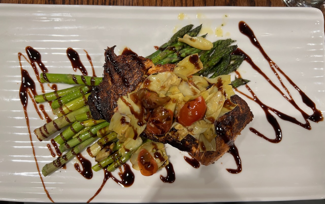 Update again: Friends took us out tonight and we chose Augies again. Same week! Again I don't remember having better salmon. The picture is of the menu item called blackened salmon, which usually comes with potatoes as well. I requested double asparagus instead. Besides the great service, waiter David paid us rapt attention. Refilled glasses as they approached empty. Super,...
