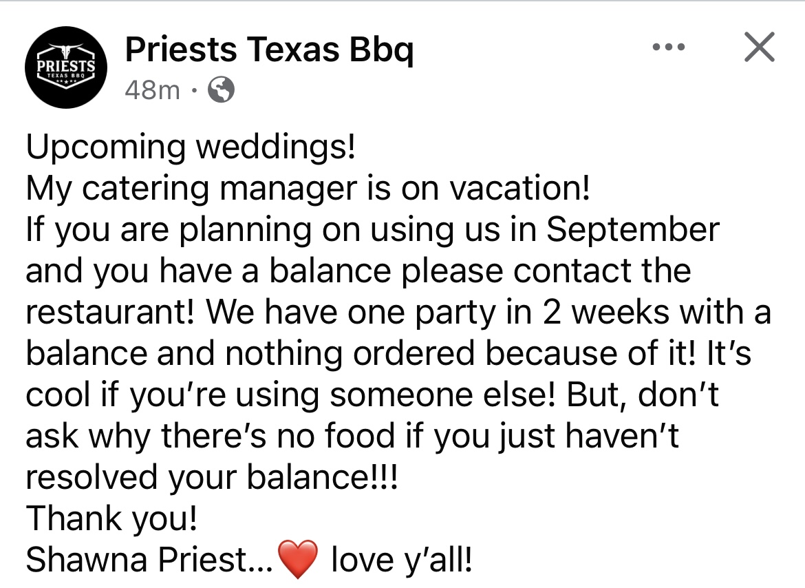 We had them cater our 2024 September wedding. The food was great, however there was still a balance that needed paid in full a few weeks before the wedding (which is completely understandable and my mother-in-law was going to take care of it) and instead of personally calling or emailing me, they posted about it on Facebook, which was not appreciated (especially since people I know follow the page and knew my wedding was in a couple weeks, so it was easy to pinpoint who it was about). Another time I ordered from here, I got the brisket plate (around $16), I got home and there was no brisket. I called and left a voicemail with my number, letting them know we didnāt receive it and if they could call back so we can either pick it up sometime or get a refund. They never...
