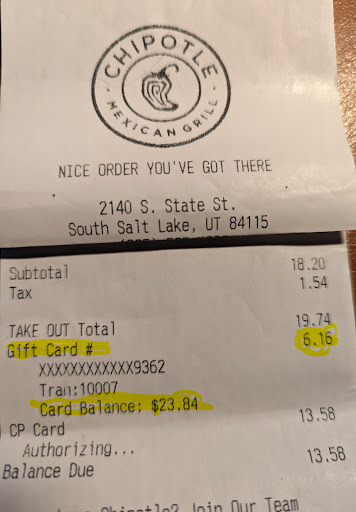 Read moreWe have had great experiences at Chipotle, but I want to warn others off from this location. 1) We tried to use one of their $30 gift cards but the employees claimed it had only $ 6.16 on it. Even though I had checked it. When we got the receipt it showed balance on card $23.84, good thing that I got the card back from them and didn't let them trash it. 2)They were so focused on their catering business that the restaurant was an unwelcome place to just sit and eat. Most of the space was being taken by the catering efforts. Their employees where shouting in spanish instructions to each other in spanish. Maybe they didn't think we understand them and therefore we don't hear the noise. Por cierto, te compredemos tambien! We couldn't stay there to eat 3) When we got home with the food the sofritas and chicken bowls that we got were so spicy hot that we had to dillute it to eat them good think we went home so we could dilute it. Had we been there we would have asked for a refund....