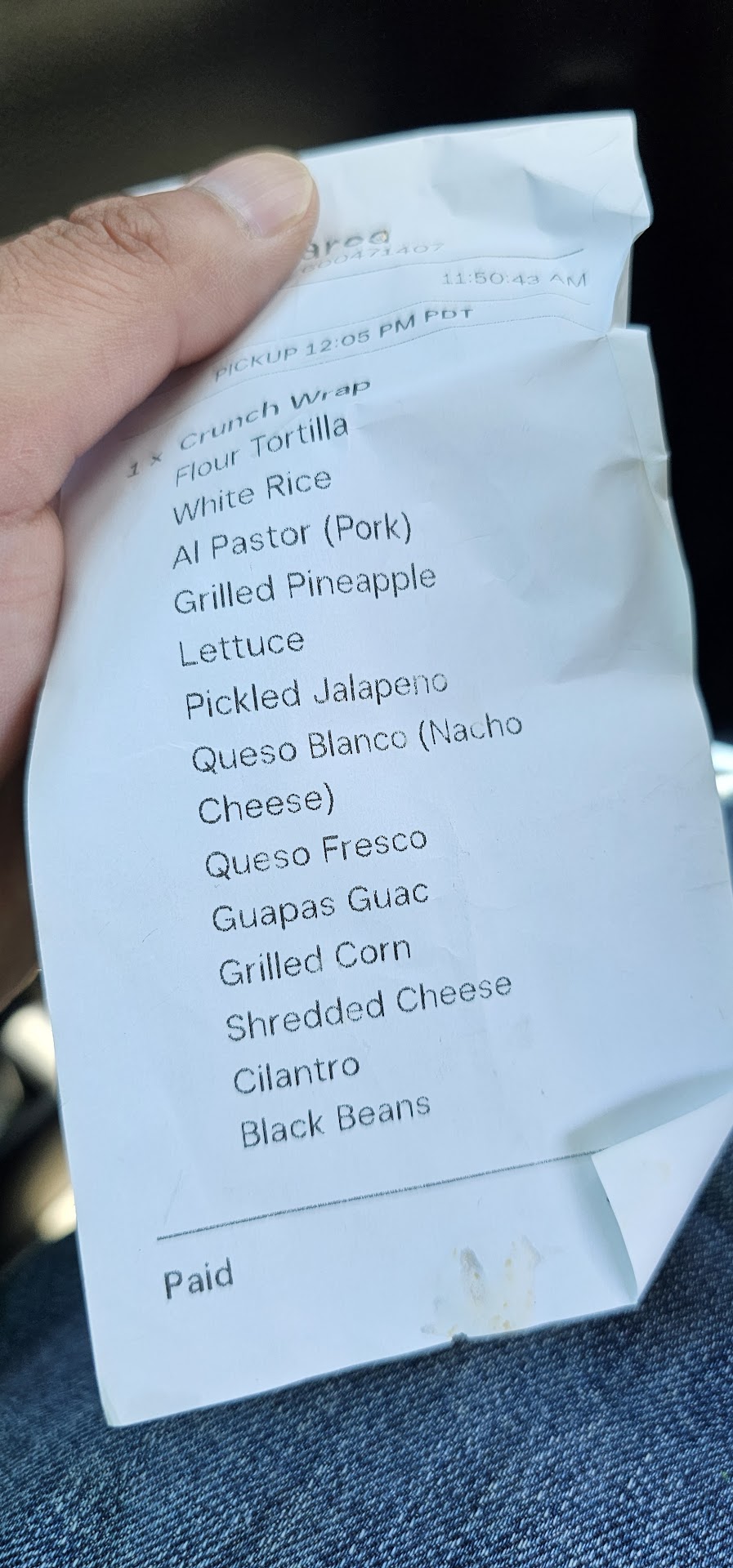 Read moreOrdered online and added some extras on my crunch wrap queso fresco, queso blanco, grilled corn, grilled pineapple, shredded cheese and black bean; When I got home to eat my wrap noticed none of those items I ordered were in my crunch wrap, just meat rice and disappointment. Total bummer when you pay for extras. How do you miss so many items? Had drive across town to try out this spot. All hype better of going to the...