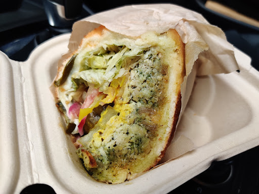 Today, I had my leftover half of the Hills. To be honest, the roof of my mouth thanks me (cause Dutch Crunch). The Hills featured ample amounts of shredded chicken that's been generously tossed in pesto. It also features provolone cheese and the famed Hidden Sauce. My friend also added pretty much all the fixins which totally elevated the sandwich. The pickles and peperoncino added the twang while the jalapenos brought the heat. It was SO GOOD.