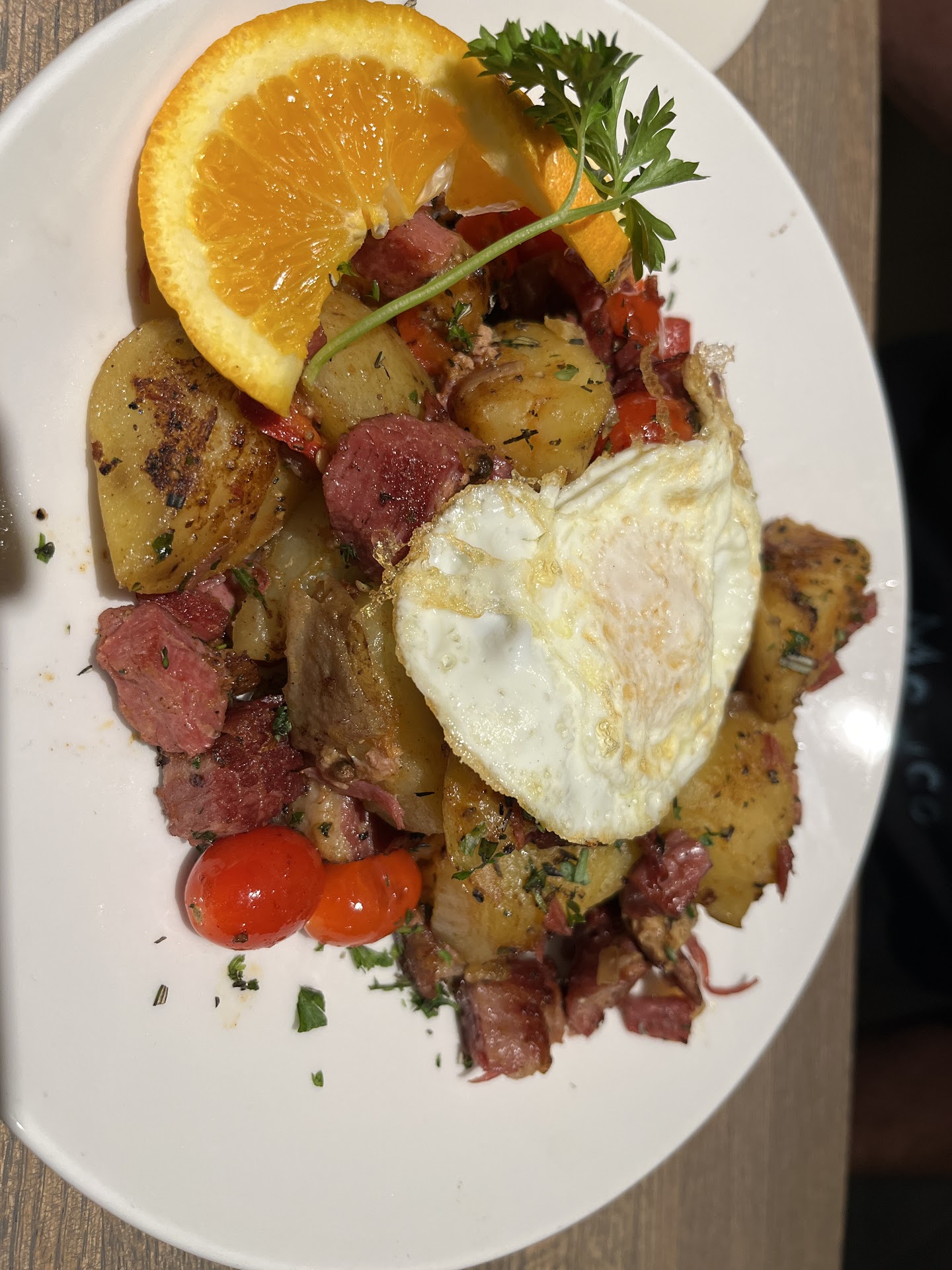 The Ruben (corned beef with sauerkraut with melted Swiss cheese on toasted marble rye) was savory and delicious, and the skin on steak fries were so good! Lightly salted, and crispy on the outside and soft on the inside.