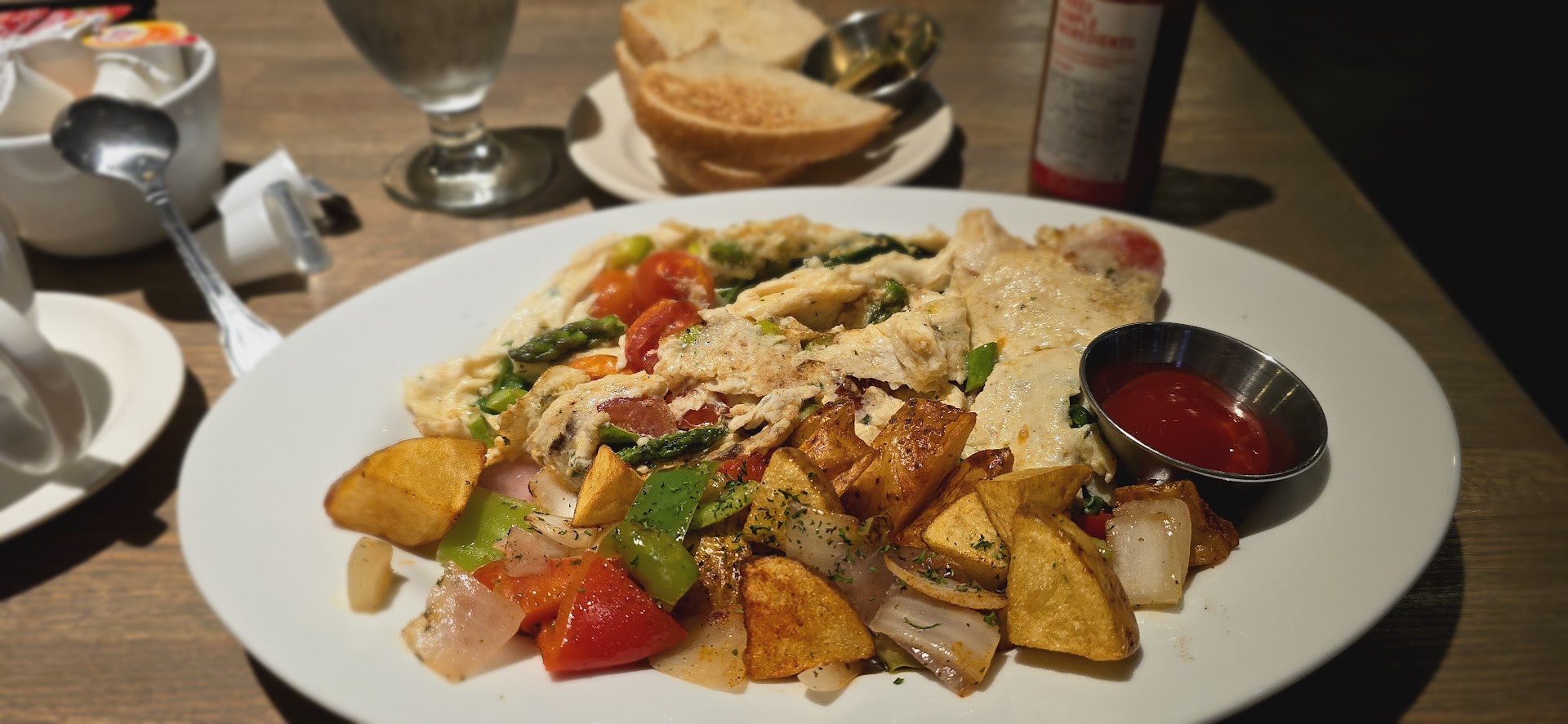 My choice, the "farmers scramble," arrived on a pre-warmed plate, a positive touch. However, the scrambled egg whites themselves were a rather standard execution. The expected medley of vegetables – bell peppers, potatoes, and anions (presumably onions) – lacked the vibrant punch one might expect from fresh, local produce. The sourdough toast, a welcome inclusion, was saved by the real, softened butter – a small detail, but often overlooked.
