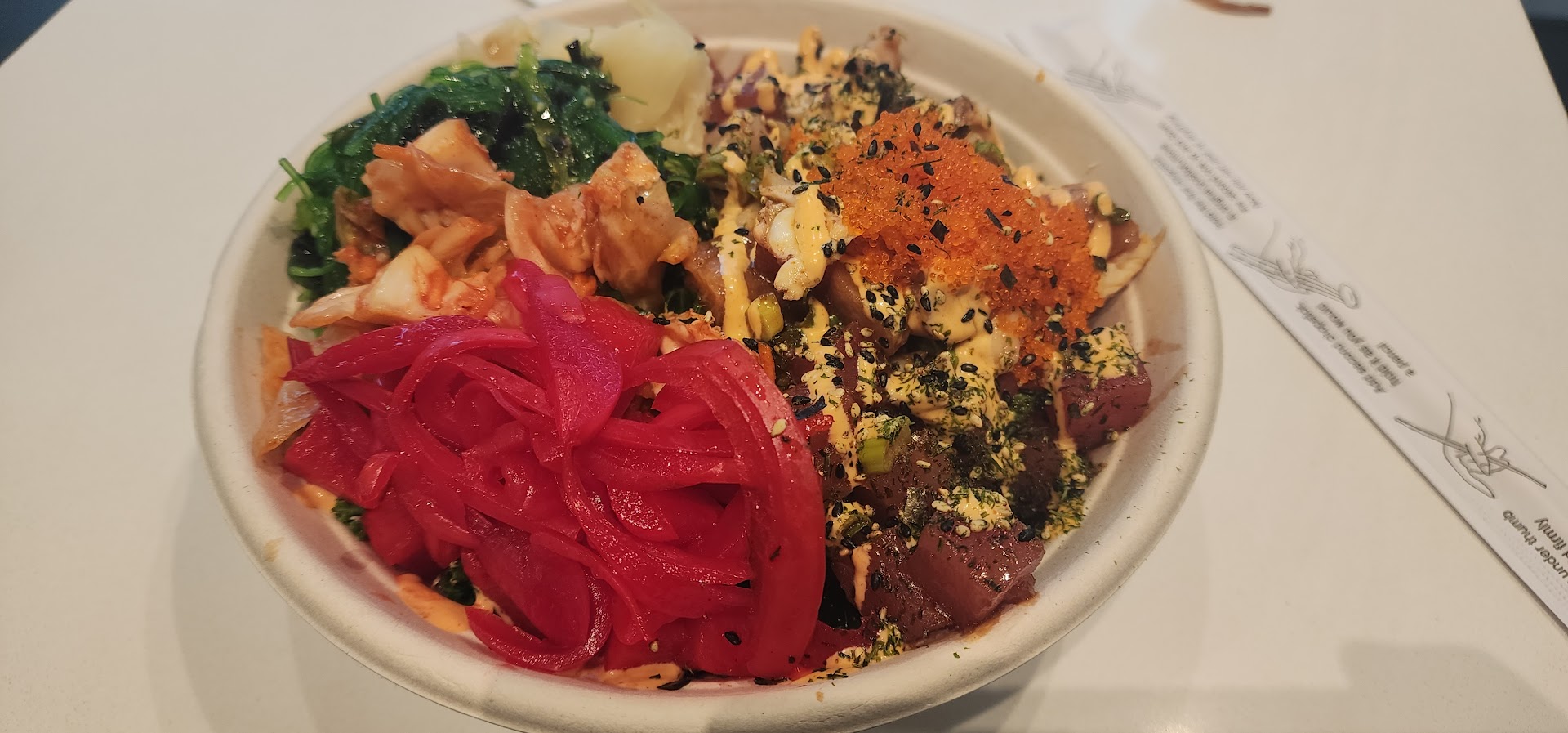Food was just ok, typical build your own poke bowl kinda place, nothing to rave about, nothing that separates them from other poke places, they also lacked certain toppings.