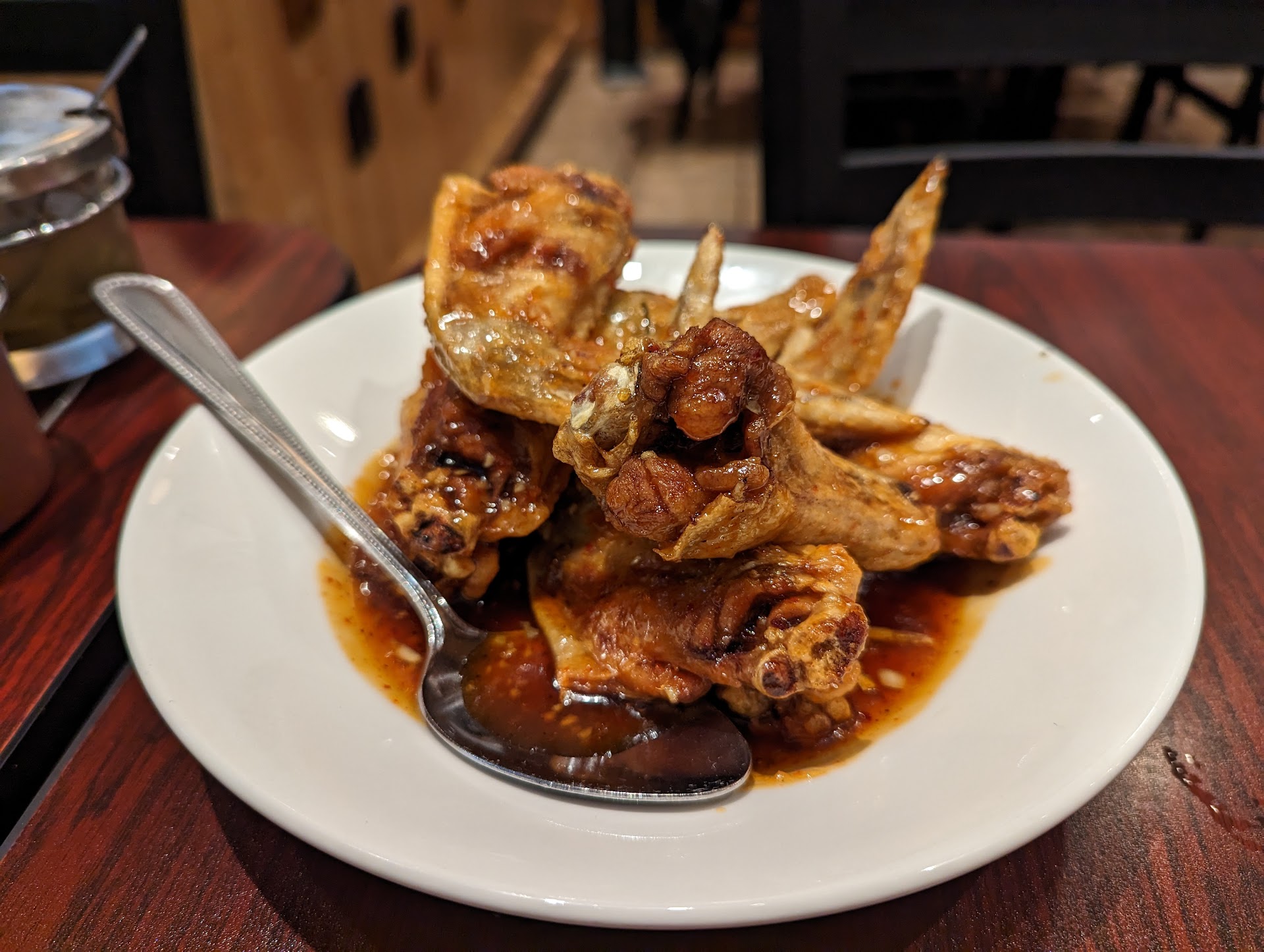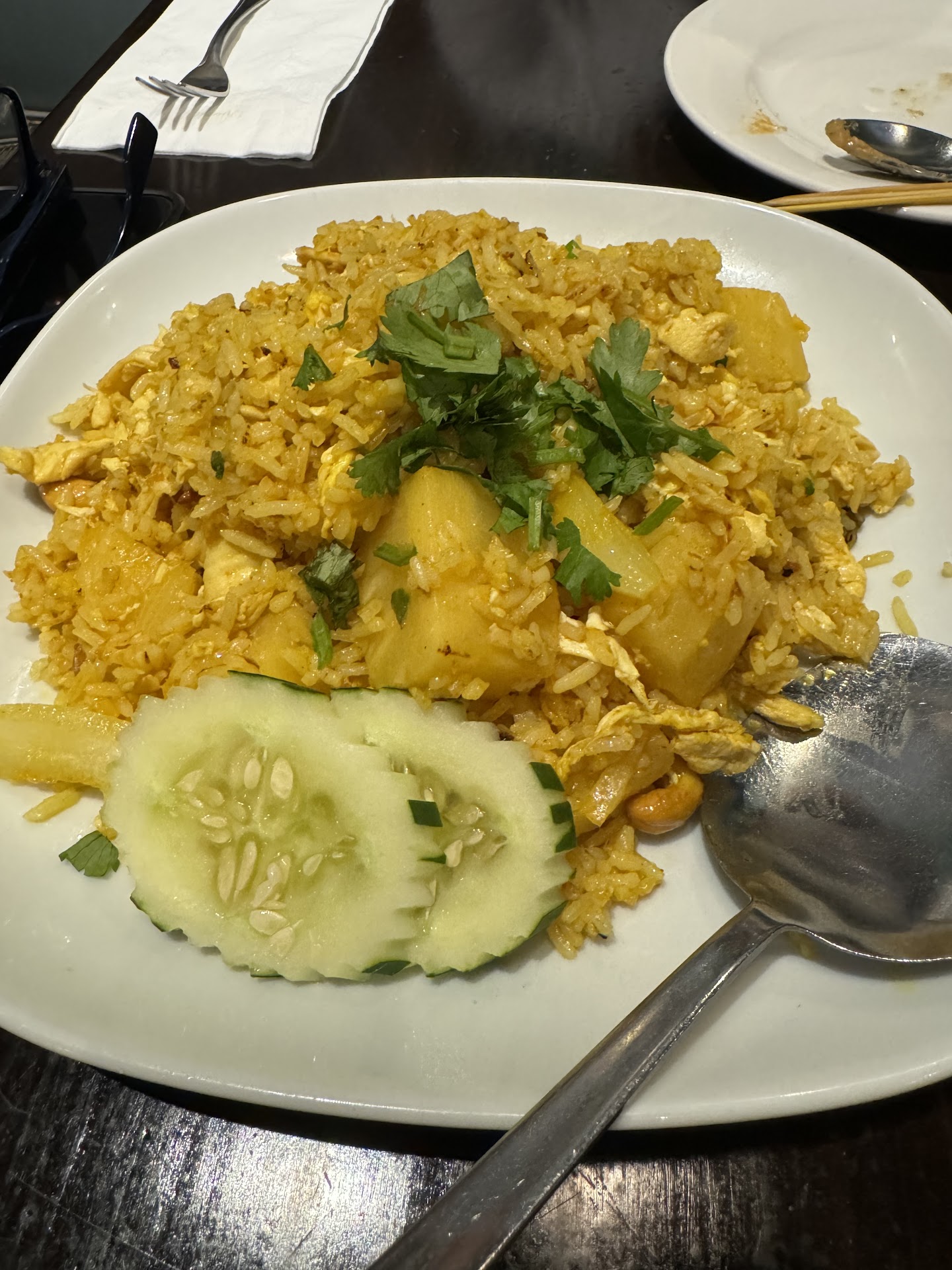 For someone who grew up in a Thai restaurant, I'm rather critical about the ones I try. I've been here twice; the first time for Thai iced coffee (a delicacy in the states) and the second to try the food. I ordered the Duck red curry with brown rice on the side, the bf got duck fried rice, and we shared angel wings as an appetizer. The food was hot, perfectly spiced, though they also provided classic Thai condiments on the side (I used the Thai chili in fish sauce for my curry, and suggested the jalapeno in vinegar to my bfs dish). We cleaned off the wings, perfectly crispy, sweet and savory, and the sauce, while not what I'm used to from my parents place, was still incredible, I could have drank the rest. The curry was wonderful, though I wish they added spinach to it, but the pineapples and red bell peppers were perfect. The fried rice was plain looking, but really quite nice. I would have added the angel wing sauce to the rice, personally, but the over flavors were gentle but still present. I wish we could have tried the roti dessert, as that's also hard to find in my experience. Most things here taste like what I recall from my childhood, and that's a huge deal to me. I will be returning to bring my family and see what they think. If you're looking for solid Thai food, this is an...