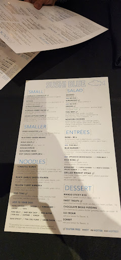 Read moreI make my best attempt to understand that some experiences aren't as up to par because of certain circumstances, but I feel like ours was no exception. We ordered a to go order of 3 hand rolls off the lunch special and one regular special roll, the Hustler. It still took over half an hour for them to make the order even after witnessing that we were the only ones waiting on an order at the time. I understand that sushi craft typically can be time consuming, but for what little we ordered, it just seemed like there was no concept of time. Not only that, but we were charged the $10 on the hand rolls instead of the $5. I understand that we all make mistakes, so this was not a big deal, but even after the mistake was corrected, they charged us for sauces that we requested and didn't provide them. Considering the Hustler roll we ordered was $17, I was hoping the overall outcome would be satisfying, but the roll looked like it was literally tossed in the box, and horribly cut. I understand that you are compromising plate presentation when ordering carry out, but I felt cheated paying so much for a roll that was a mess. I was so thrilled to have my first experience with Sushi Blue, but surprised and bummed of the...