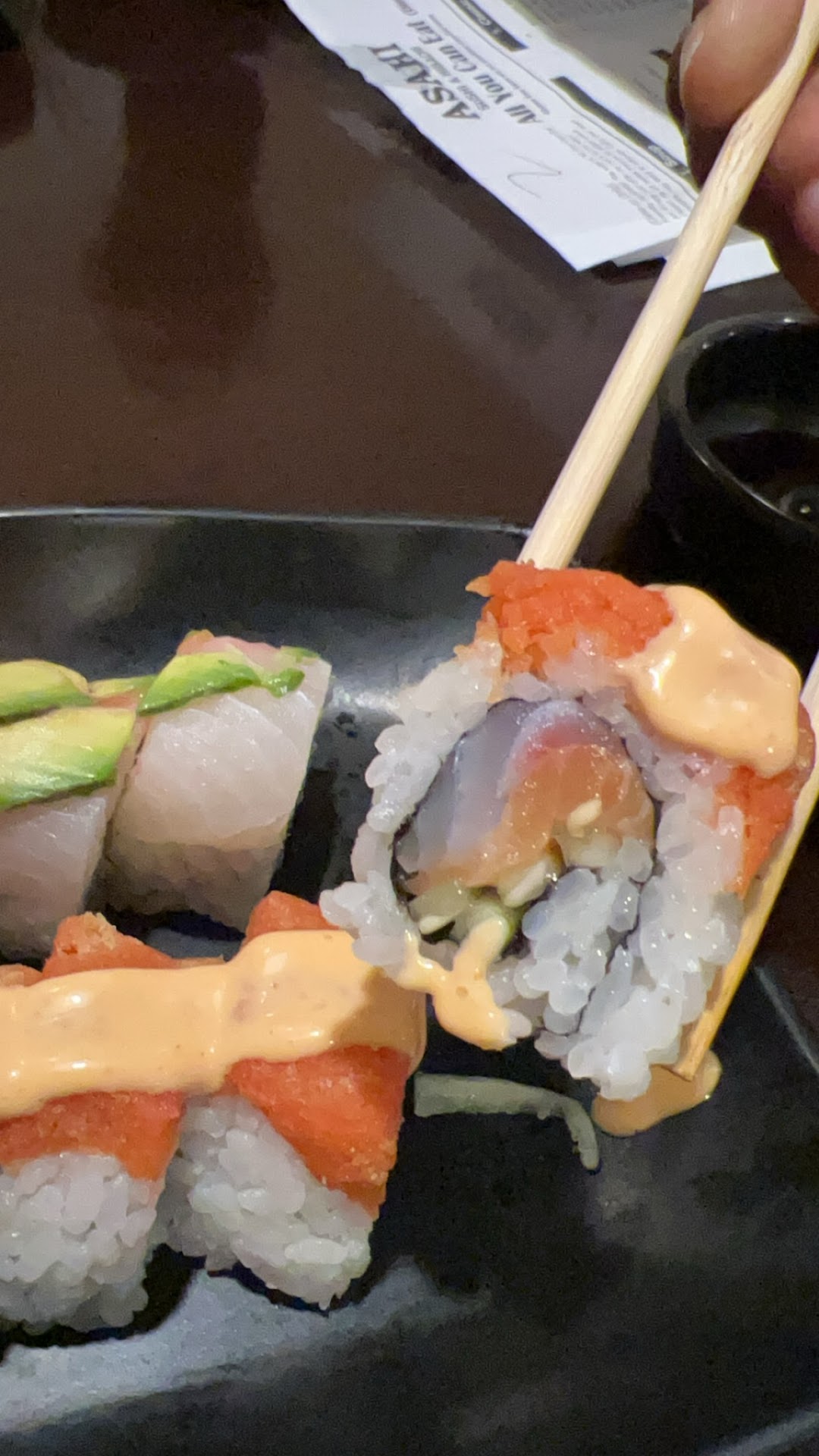 Incredible & Awesome!! Had this style of Sushi & habachi in Colorado Springs and Asahi was heads and tails above the restaurant in Colorado and we thought that had been good!! Now, keep in mind the plates are smaller portions so you can sample a amazing variety of dishes and I recommend you do just that as I can truly say there wasn't a single dish I was disappointed with. For 6 people, each person could not stop singing high praises for the food and staff!!! I had the miso soup to start with, along with the dumplings, Kani salad and seaweed salad. Truly Wonderful!! Then had the Monster specialty roll and General Tsao chicken, just fabulous!! Next time around, 2 orders of the Kani salad as it was that good the first time. Also I saw the Volcano specialty roll last time around so gave it a try as it is spicier. I was not disappointed. Now, don't be afraid of the spice as it is flavor not heat but it is delicious just as was the Monster specialty roll. I added siarracha for the heat I like!! Yummy!! This time around I had another order of General Tsao chicken, as good as the first!! Added siarracha again for my heat level. Also note, the fried rice with the dish is very good and yes, again siarracha. Now mind you, I practice a Ketogenic diet/lifestyle with intermittent fasting, so I only eat once a day and I ate this food knowing it would blow my carb load out of the water!! However, I choose when to go off diet and eat carbs and this is one of those times it was well worth it!!! Now, as I said, I eat once a day so in I went for round 3!! This time 2 orders of Kani Salad, yes it is that good!! Dumplings again, along with the Volcano Specialty Roll again and this time an order of the Scallops with vegetables. I will tell you the 3 large, perfectly seared, browned, flavorful scallops with the zucchini in the brown sauce was probably the perfect ending to a truly wonderful meal celebrating our return of two children from the US NAVAL ACADEMY (freshman son and sophomore daughter) and the oldest son who just graduated from the US AIR FORCE ACADEMY and last week graduated from his INITIAL FLIGHT TRAINING PROGRAM where he passed his FIRST SOLO FLIGHT and CHECK RIDE!! (Sorry, proud Dad moment, now to see if the last daughter joins our FAMILY legacy of service to our great nation as I served for 31 years with the US AIR FORCE) Now, as you can expect, with a specialty food and all you can eat it is a bit expensive. But the Groupon coupon helps a bit. They also rolled in a 15% gratuity on the meal but it was fine as they earned and were so very pleasant and attentive. In the end we paid about $137 for everything. We didn't order alcohol and I can't even tell you if they serve alcohol.