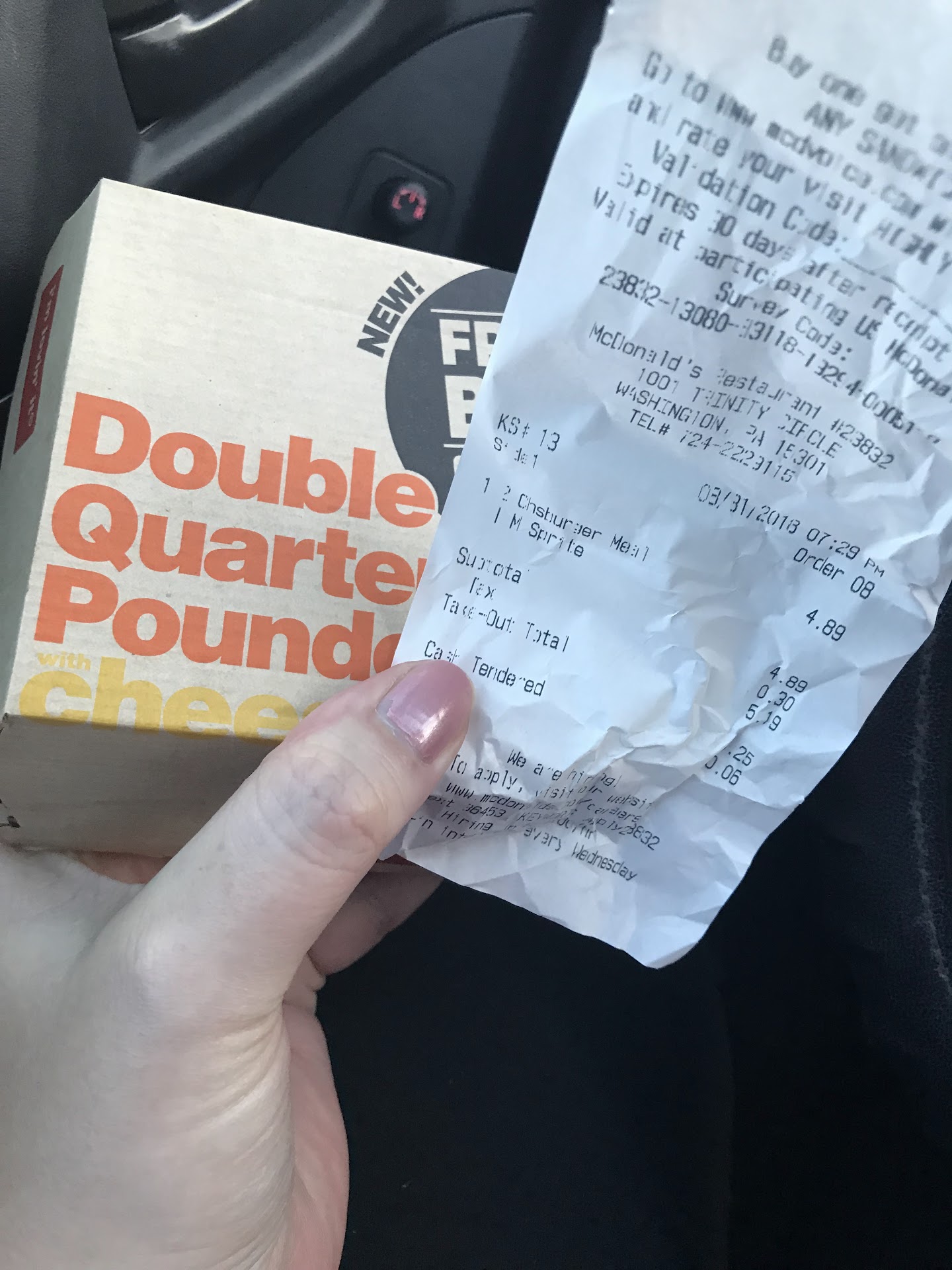 We stopped to get a couple of double cheeseburgers and a value meal. We had a slightly longer than normal wait to get to the pickup window, time but no big deal. Our order wasn't ready and we were asked to pull up and wait. There were two other cars ahead off us that seemed to be in the same situation already waiting.